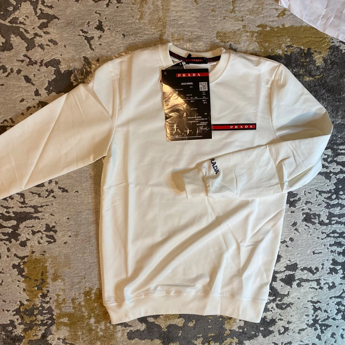 Säljer en vit tröja från Prada i nytt skick. Tröjan har en klassisk design med logga på bröstet samt ärmen. Perfekt för både vardag och festliga tillfällen. Passar bra till allt, jeans, chinos etc..