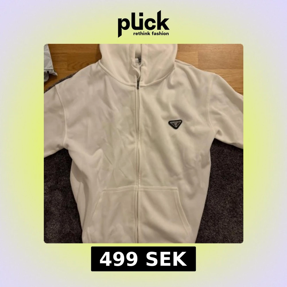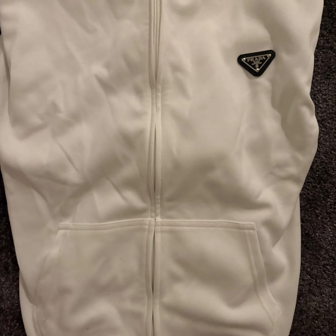 Snygg vit hoodie från Prada med hel dragkedja framtill och klassisk huva. Storlek xl med passar dom som har L