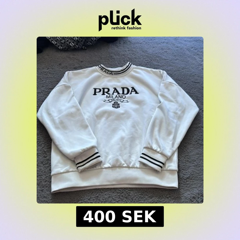 Vit sweatshirt från Prada med svart broderad logga och text på bröstet. Tröjan har svarta ränder på muddar och krage samt rund halsringning med broderad Prada-text. Långärmad och i mjukt bomullsmaterial, perfekt för en clean och stilren look.