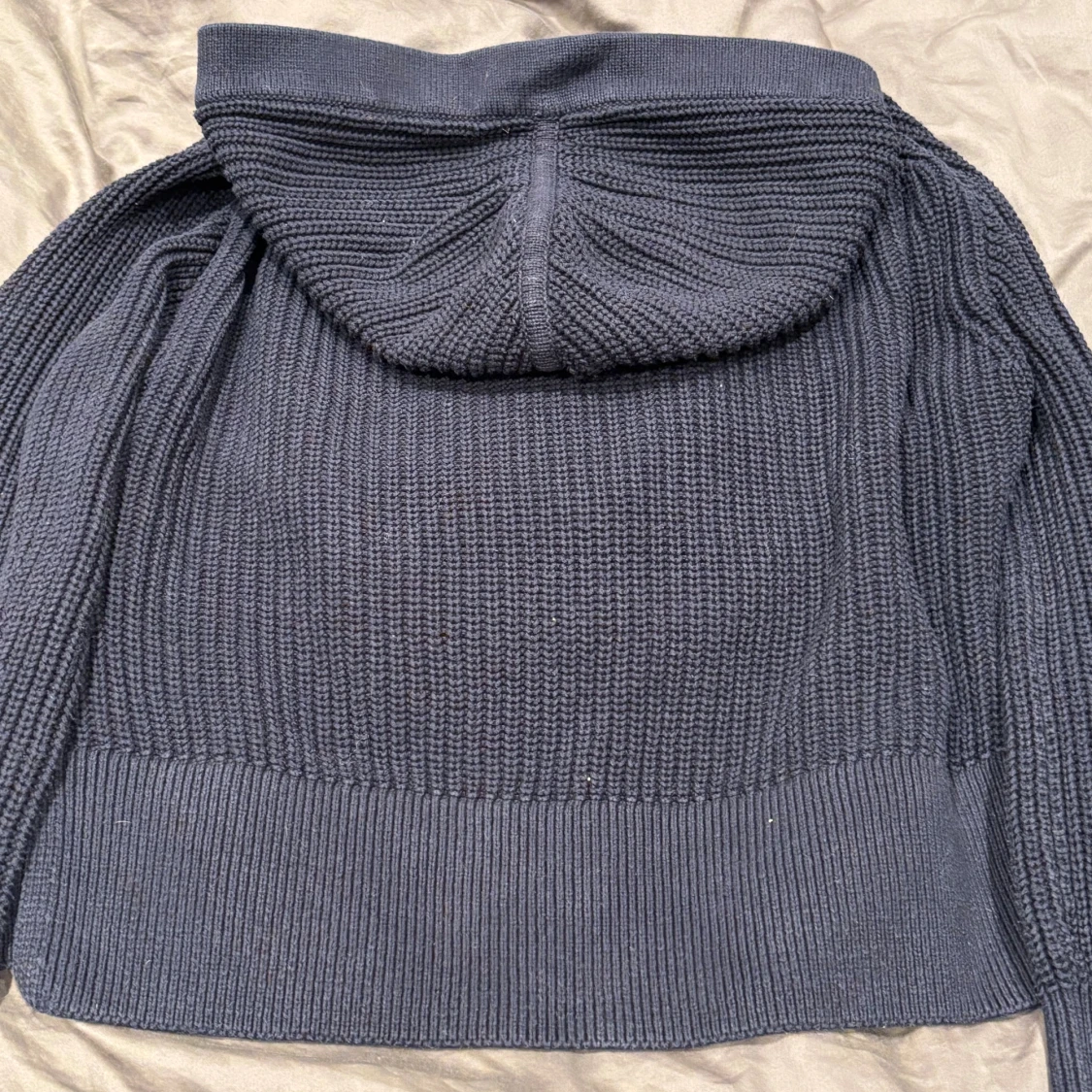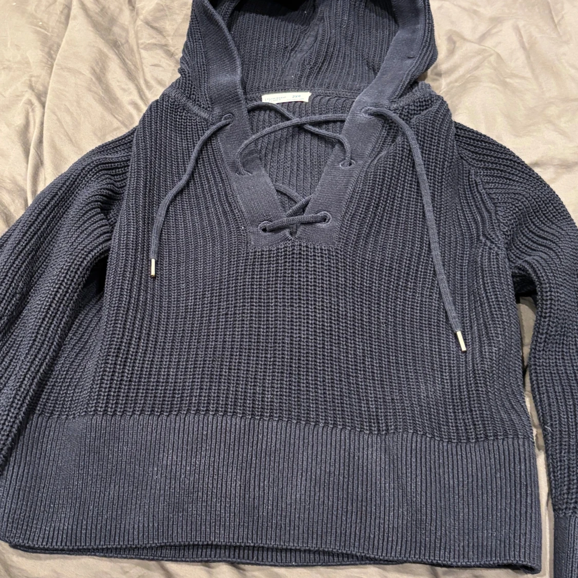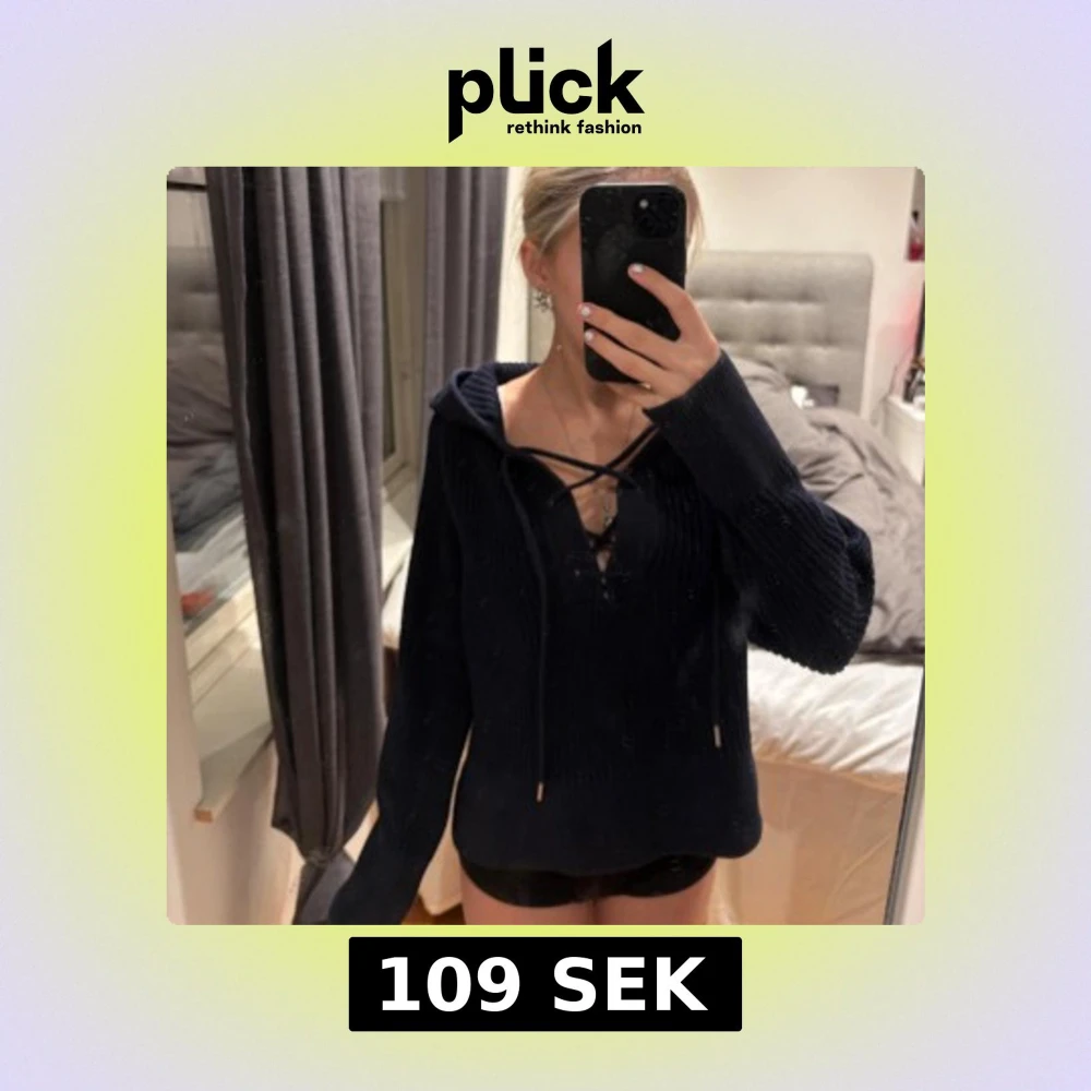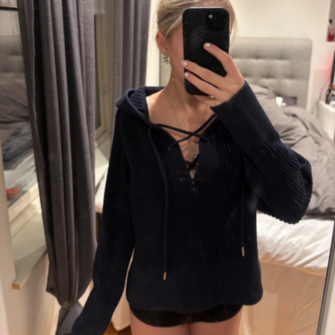 Säljer en mörkblå stickad hoodie från Primark med snygg snörning framtill och huva. Tröjan har grov ribbstickning, långa ärmar och en loose passform. Perfekt för dig som gillar chill och stilren look. Storlek 2XS.