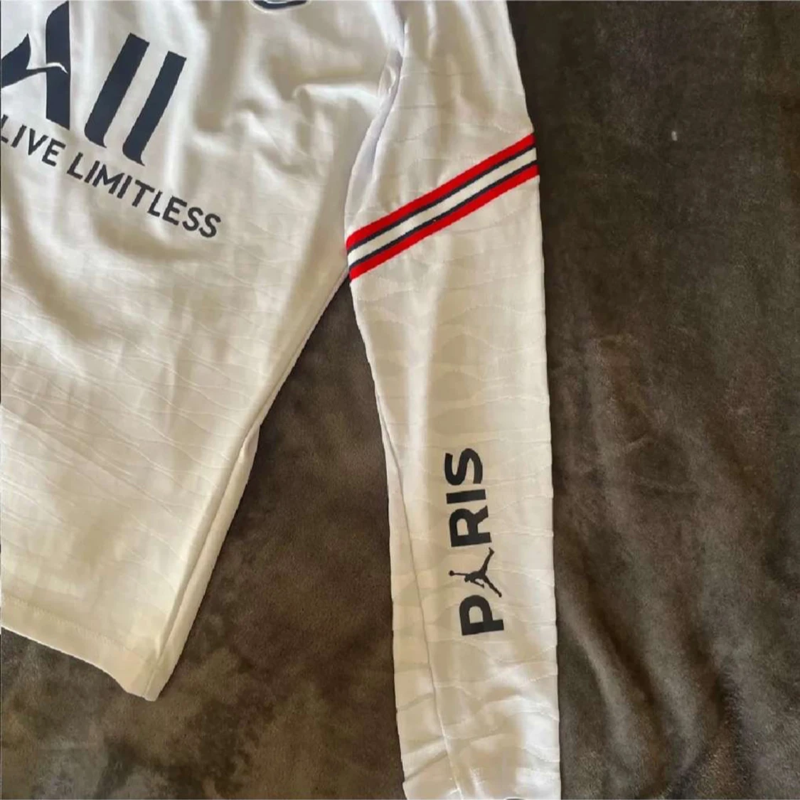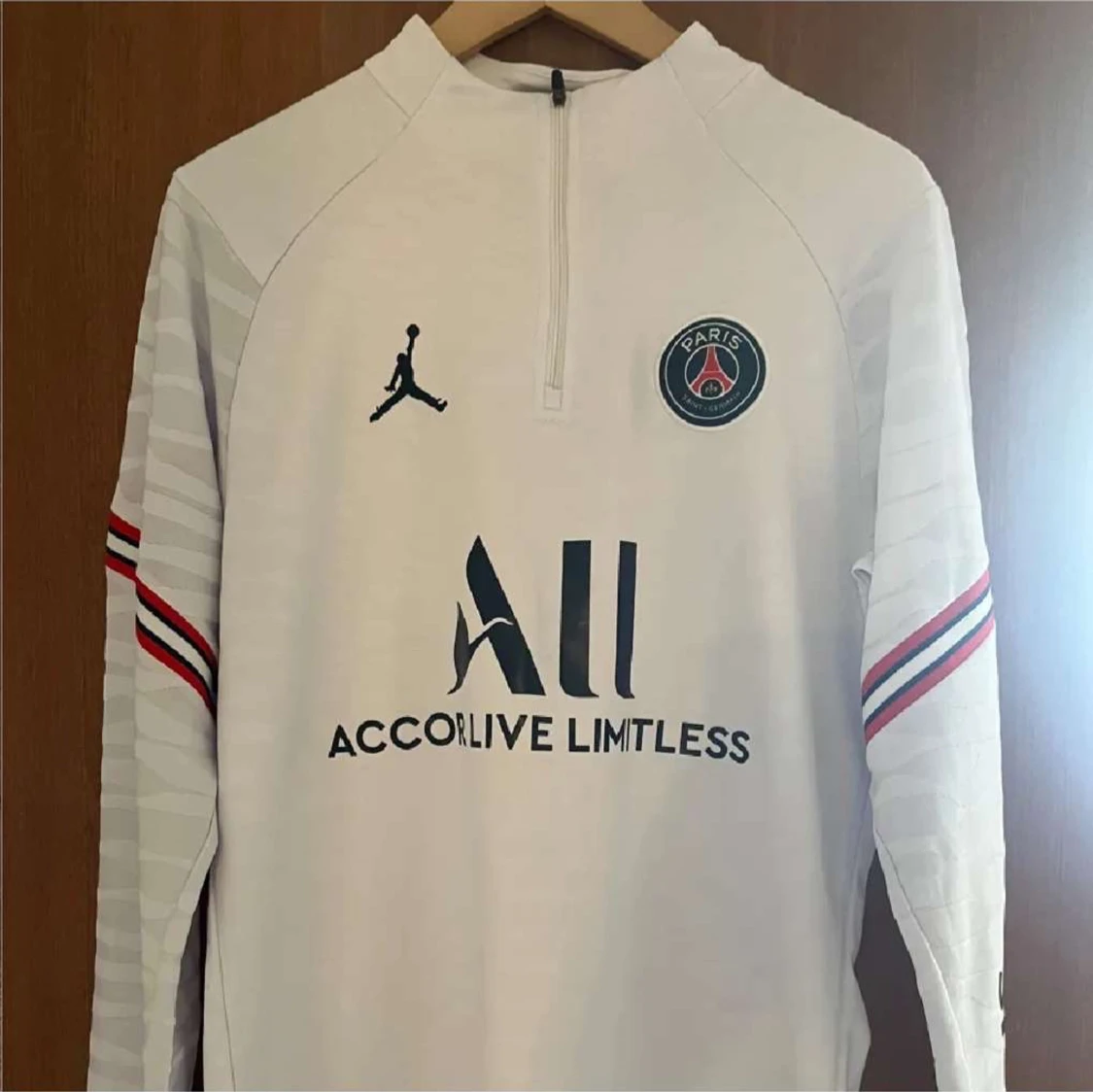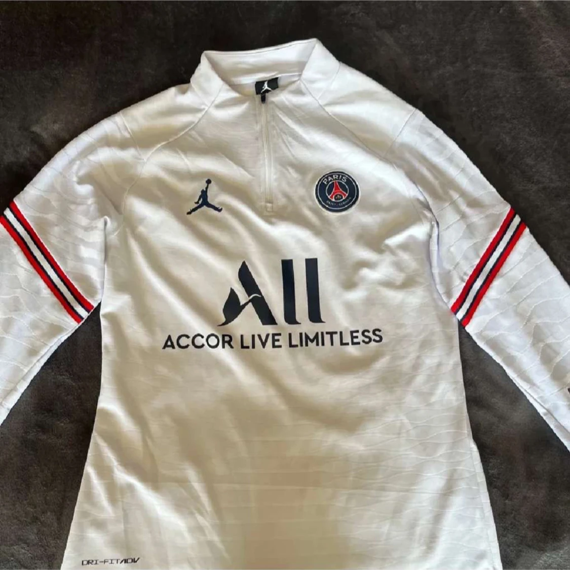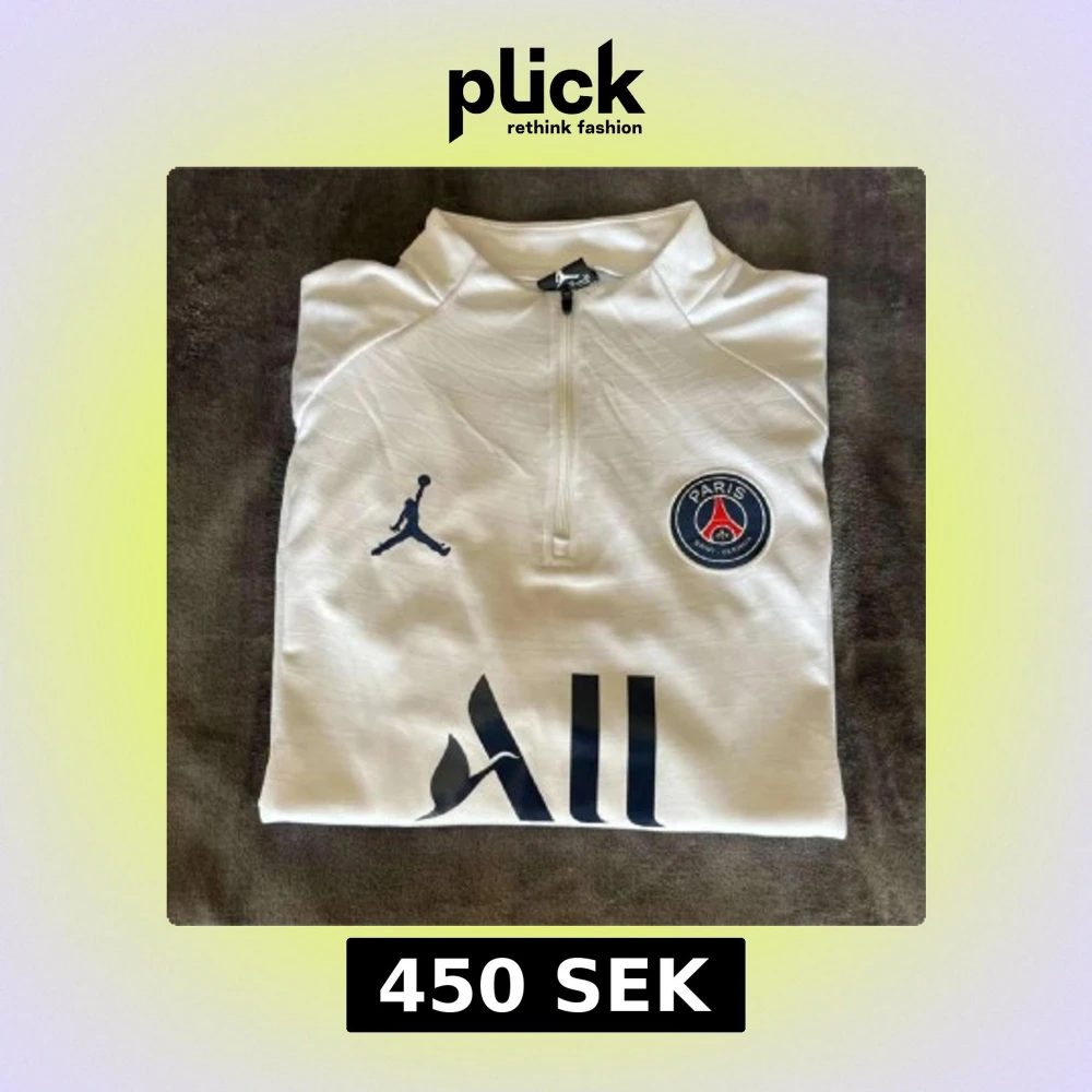Snygg vit långärmad PSG träningströja från Jordan med half zip och broderad klubbmärke på bröstet. Svarta och röda detaljer på ärmarna, tryckt logga och text på bröst och ärm. Perfekt för fotboll eller chill.🤙🤩