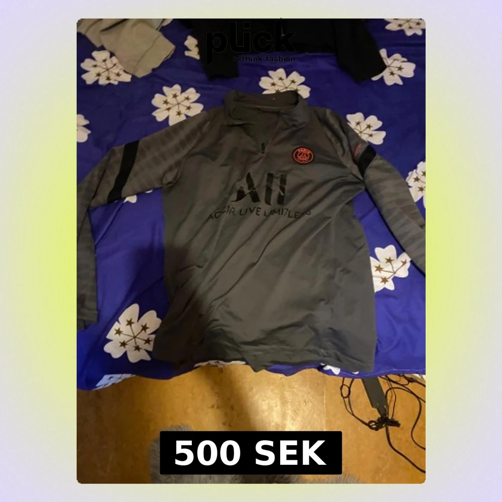 Säljer en grå långärmad PSG fotbollströja med svart tryck och röd PSG-logga på bröstet. Tröjan har halv dragkedja och diskreta ränder på ärmarna. Materialet är lätt och andas, perfekt för träning eller match.