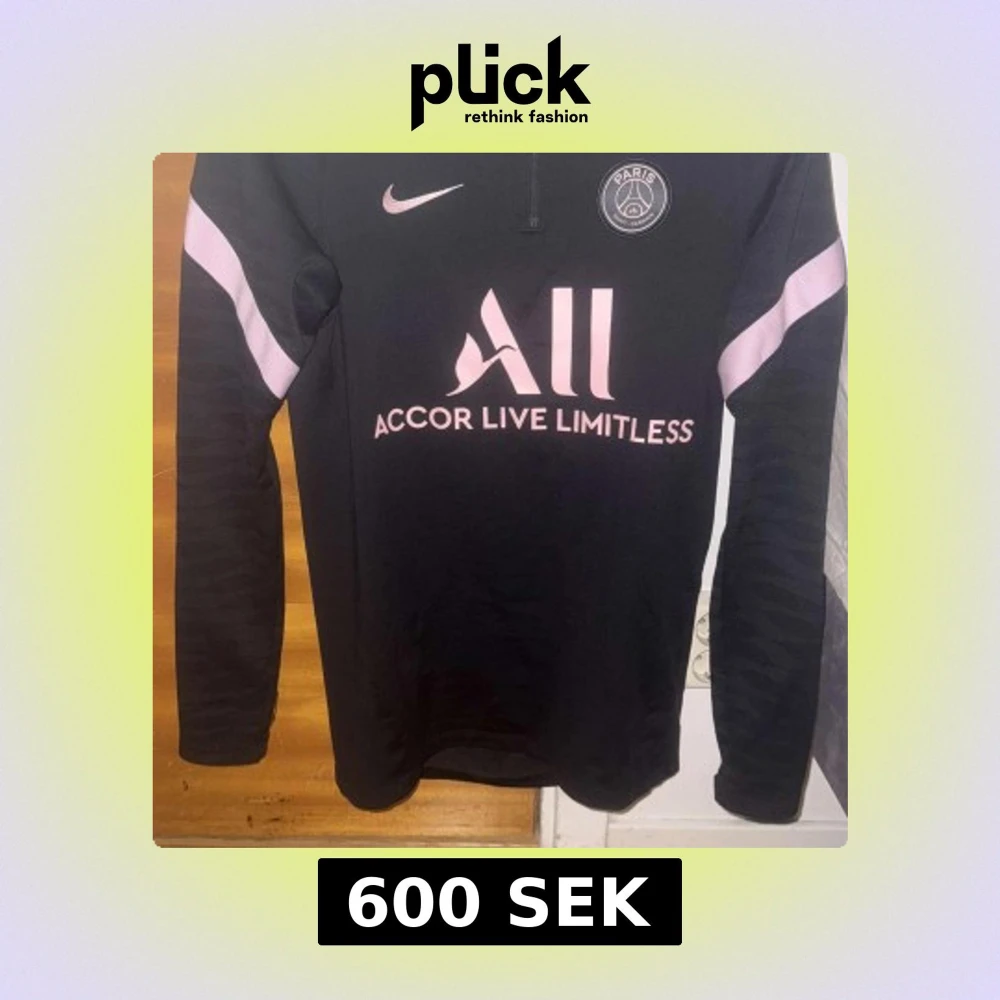 Snygg svart PSG-tröja från Nike med rosa detaljer och texten 'Accor Live Limitless' på framsidan. Tröjan har långa ärmar och en dragkedja vid halsen. Nypris 850