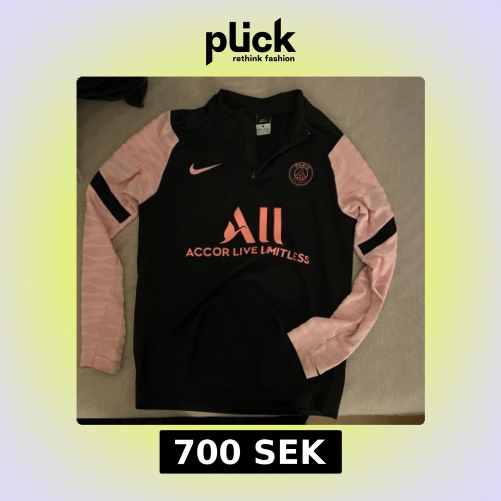 Snygg svart fotbollströja med rosa detaljer från Nike. Tröjan har långa ärmar i rosa med svarta ränder och en halv dragkedja framtill. PSG-logga och sponsortryck på bröstet samt 'Visit Rwanda' på ryggen.