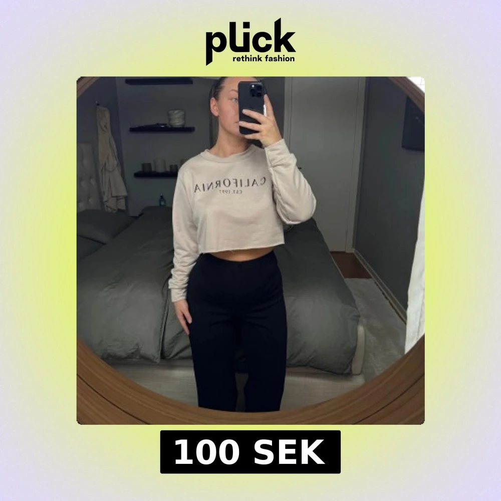 Säljer en puderrosa croppad tröja med texten 'California EST. 1997' på framsidan. Tröjan har långa ärmar och en avslappnad passform, perfekt för en casual look. Den är mjuk och bekväm att bära. Aldrig använd och liten i storleken