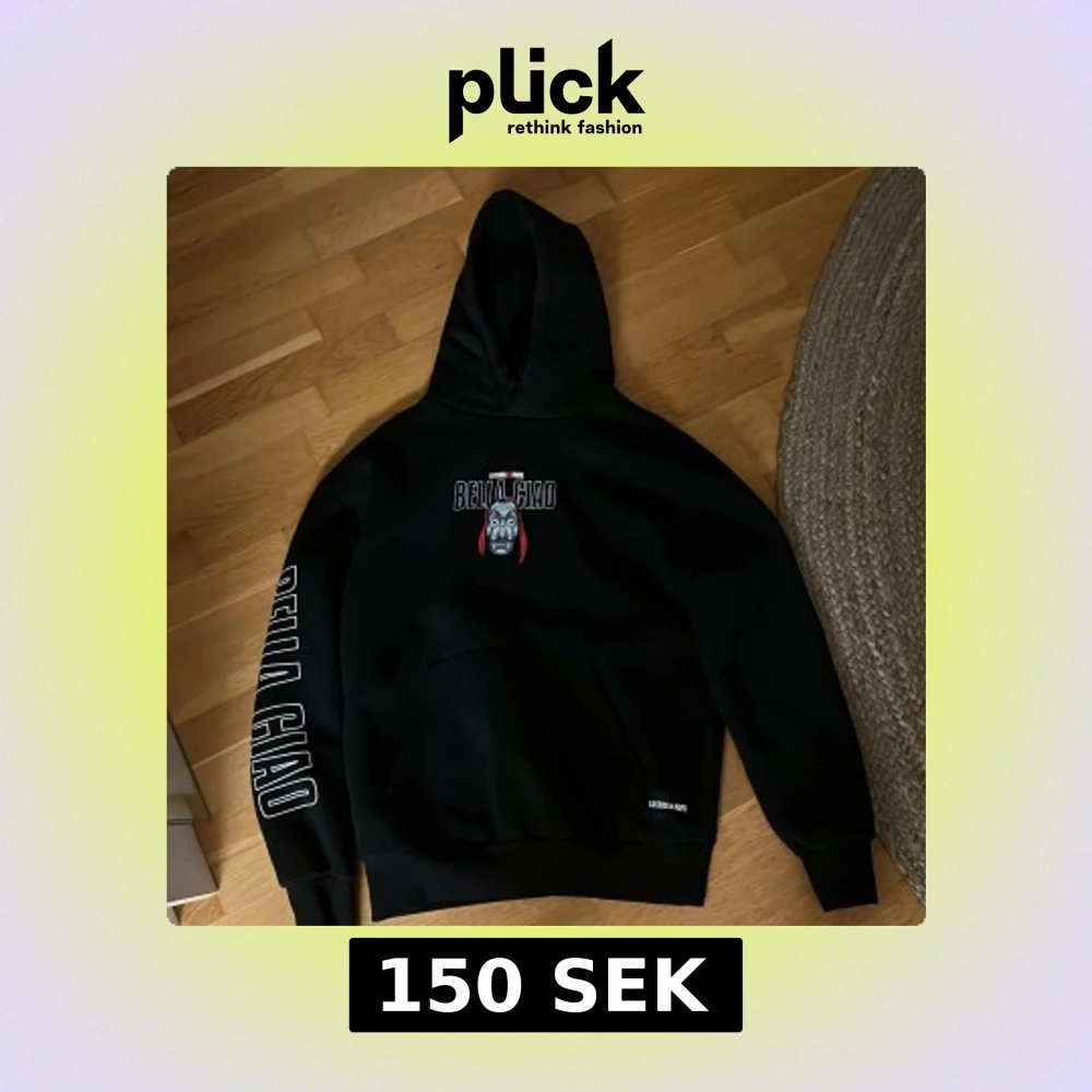 Säljer en svart hoodie från Pull&Bear i samarbete med La Casa de Papel. Tryck med Bella Ciao och Money Heist-motiv både fram och bak. Stor ficka framtill och huva. Perfekt för fans av serien!