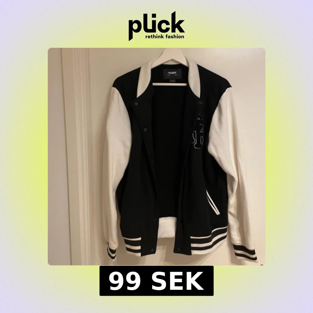 Snygg svart och vit Varsity Jacket från Pull&Bear med kontrasterande ärmar och randiga muddar. Jackan har knappar framtill och en stilren design som passar perfekt för en casual look.