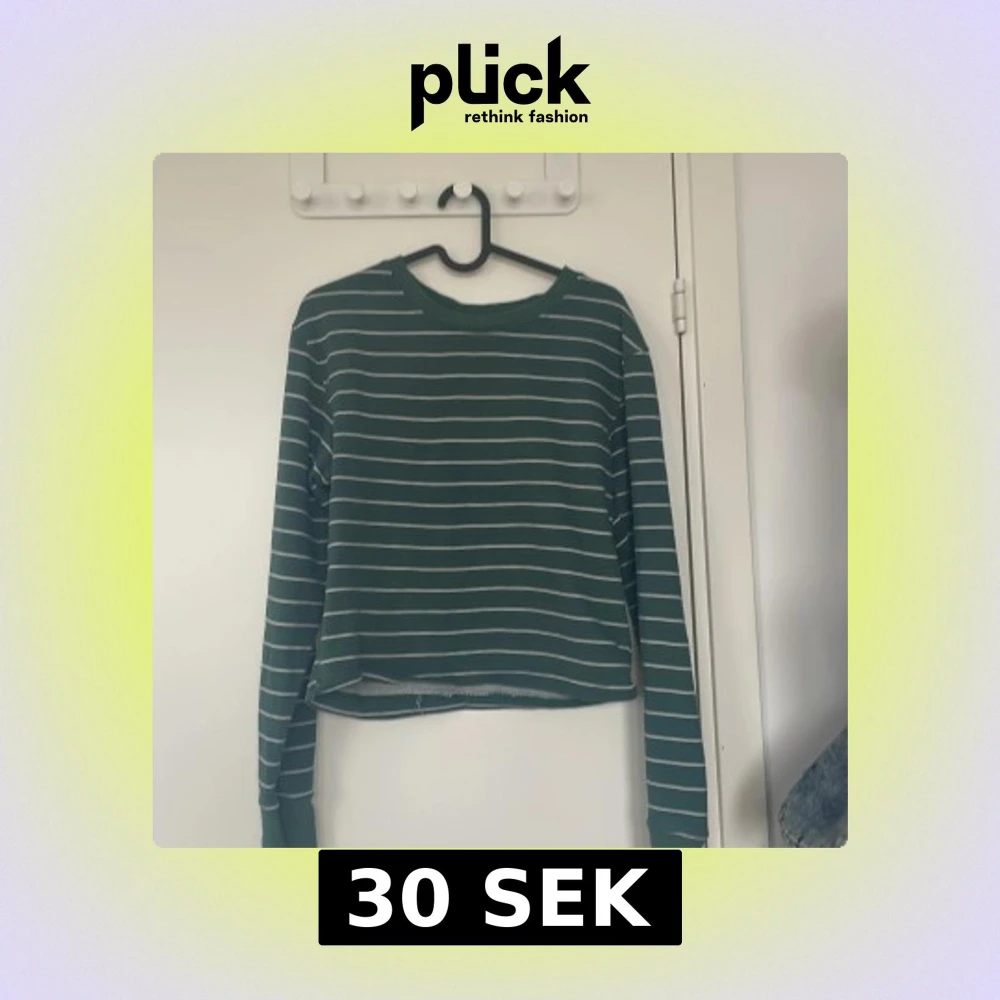 Säljer en grön långärmad tröja med vita horisontella ränder. Tröjan har en avslappnad passform och är något croppad i modellen. Perfekt för dig som gillar en enkel men snygg stil. Passar till både jeans och kjol.