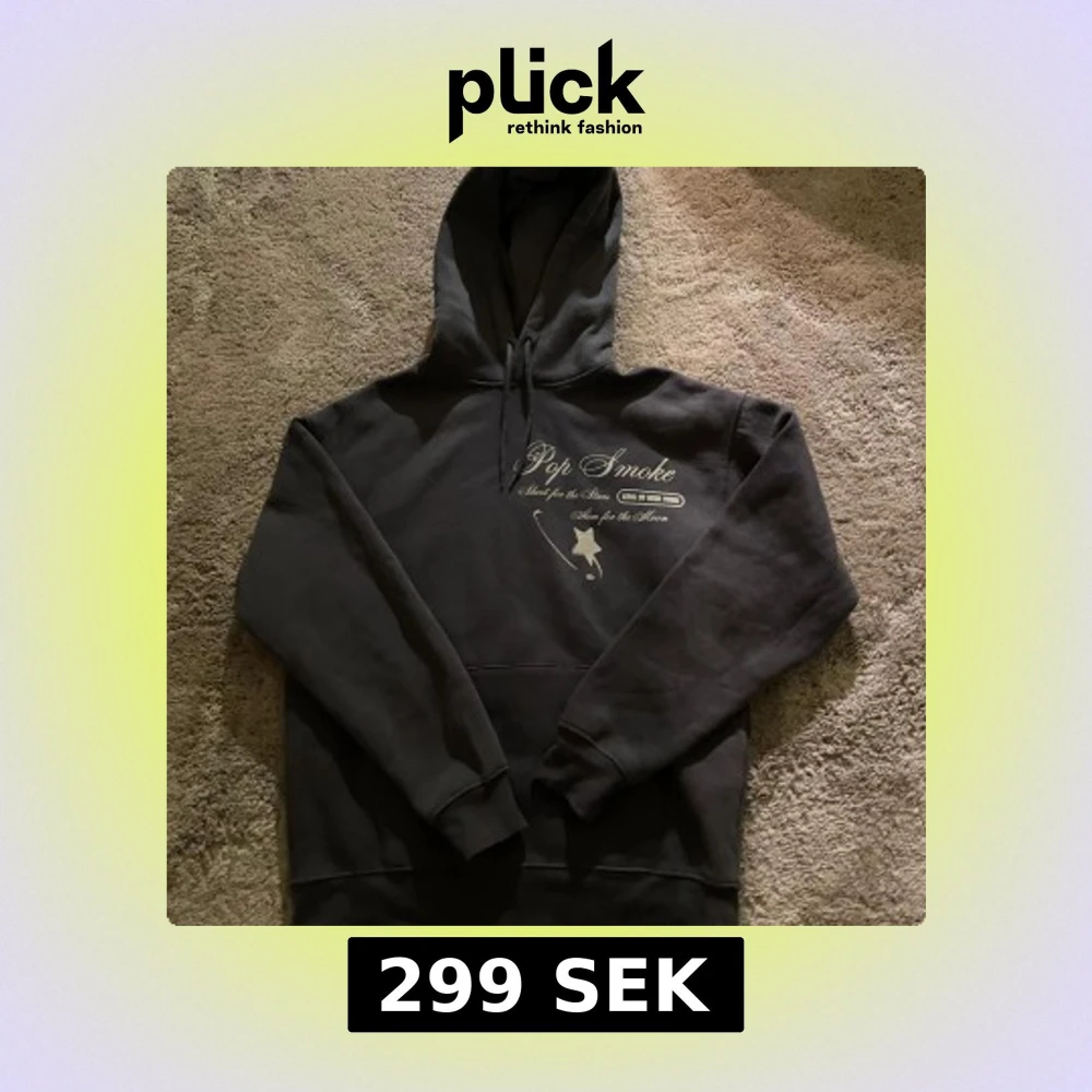 Säljer en svart hoodie med tryck av Pop Smoke på både fram- och baksidan. Hoodien har en klassisk design med känguruficka och justerbar huva med snören. Perfekt för fans av Pop Smoke.