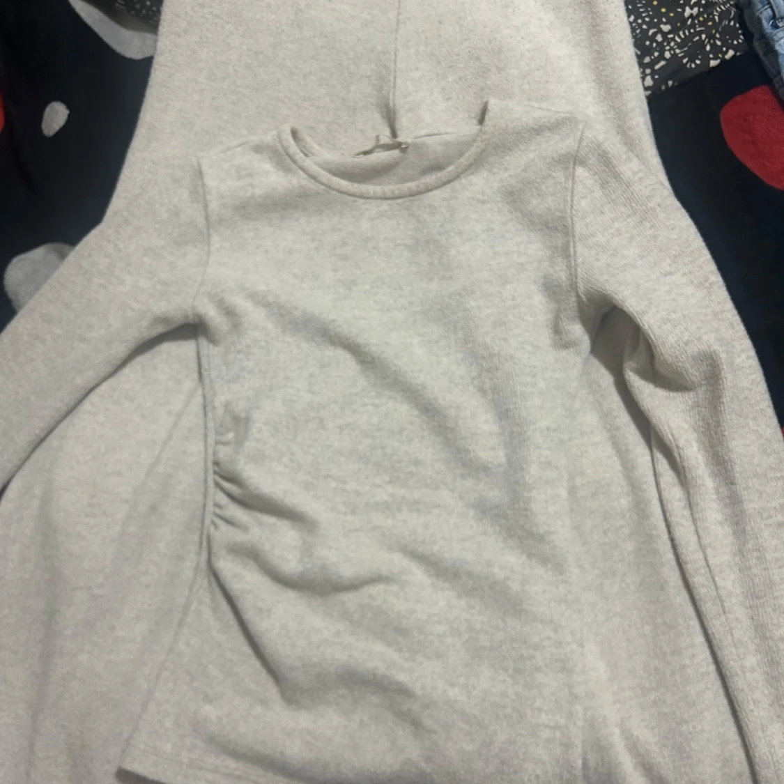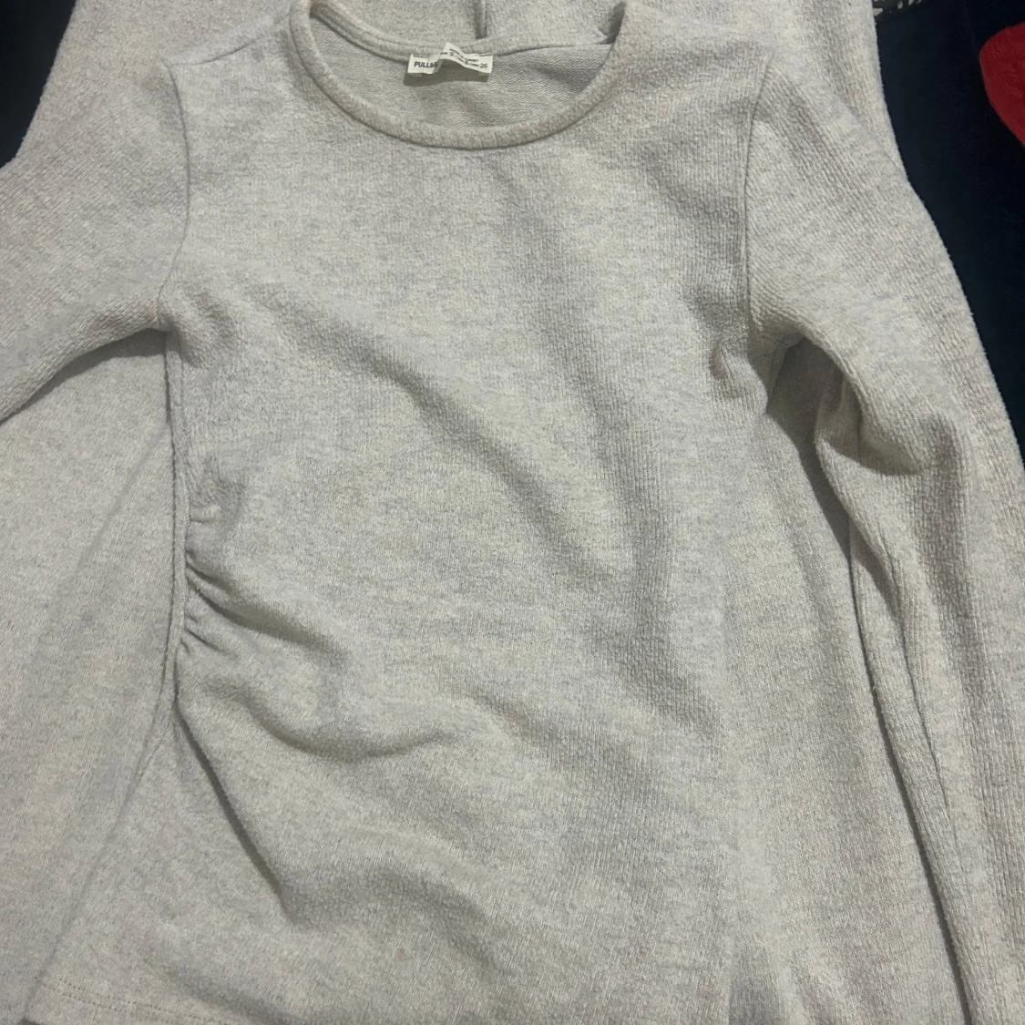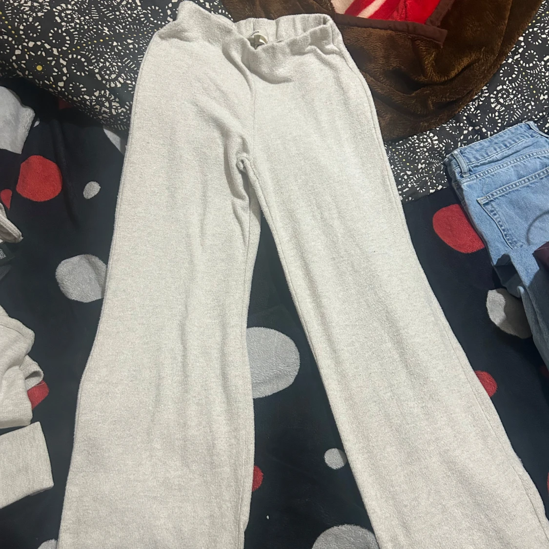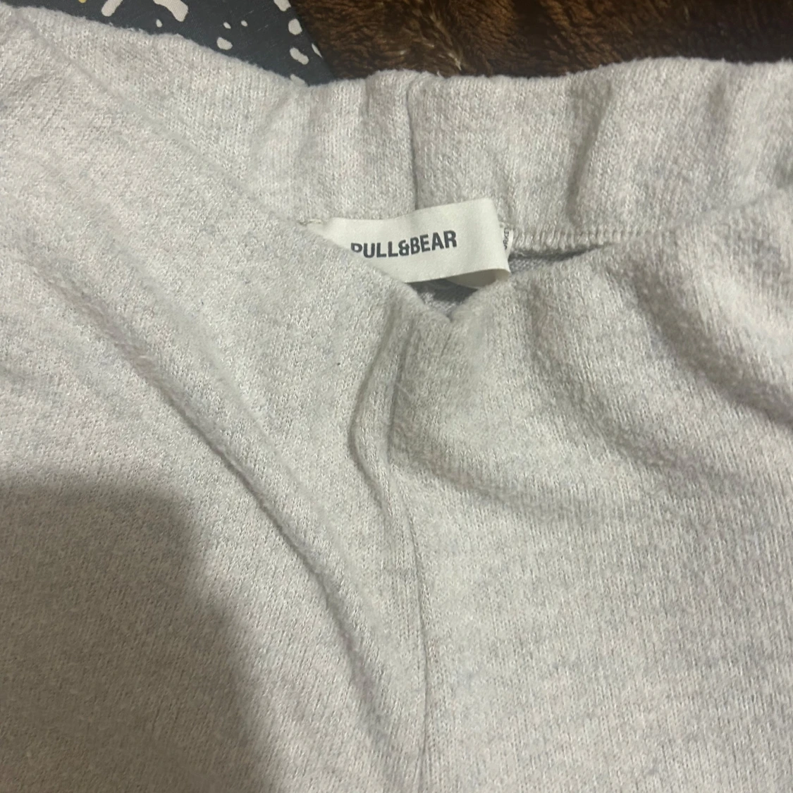 Säljer ett par bekväma grå mjukisbyxor från Pull&Bear som kommer med en tröja! Byxorna har en loose passform och är perfekta för en avslappnad stil. De är tillverkade i ett mjukt material som ger en skön känsla hela dagen. Om man vill köpa något av det separ så går det jätte bra att skriva det så kan vi diskutera pris!!