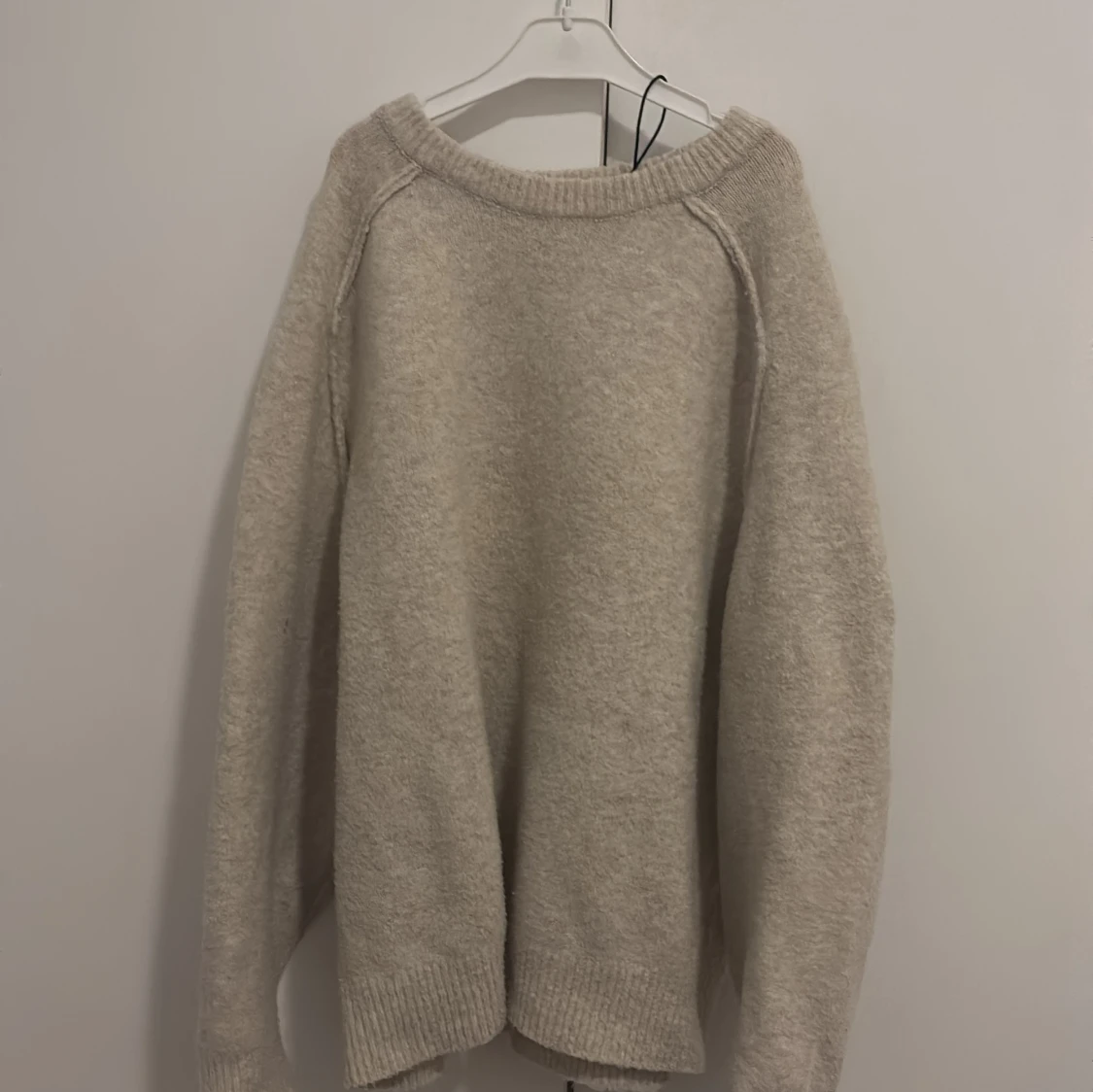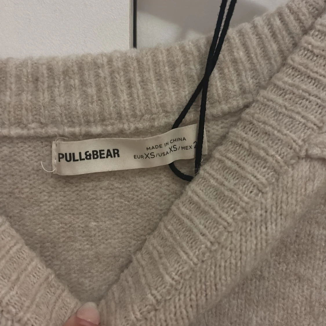 Mysig beige stickad tröja från Pull&Bear i storlek XS. Tröjan har en avslappnad passform, rund halsringning och ribbade muddar vid ärmslut och nederkant. Perfekt för lager-på-lager och chill dagar.