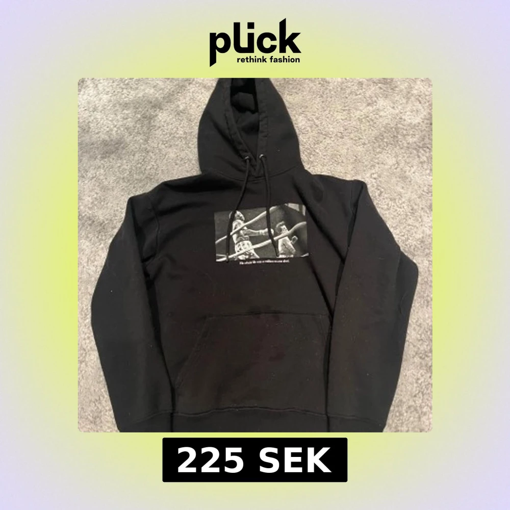 Svart hoodie från Pull&Bear med Rocky Balboa-tema. Framsidan har ett boxningsmotiv och texten 'His whole life was a million-to-one shot'. Baksidan har stor text 'ROCKY BALBOA THE ITALIAN STALLION'. Huva med snörning och känguruficka. Perfekt för dig som älskar filmklassiker.