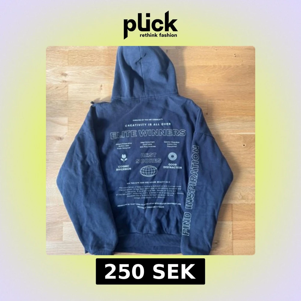 Svart hoodie från Pull&Bear med stor huva och snörning. Tryck på både fram- och baksida med texten 'Elite Winners' och grafiska detaljer. På ena ärmen står det 'Find Inspiration'. Mjuk insida och ribbade muddar. Perfekt för dig som gillar streetstyle.🌸✨