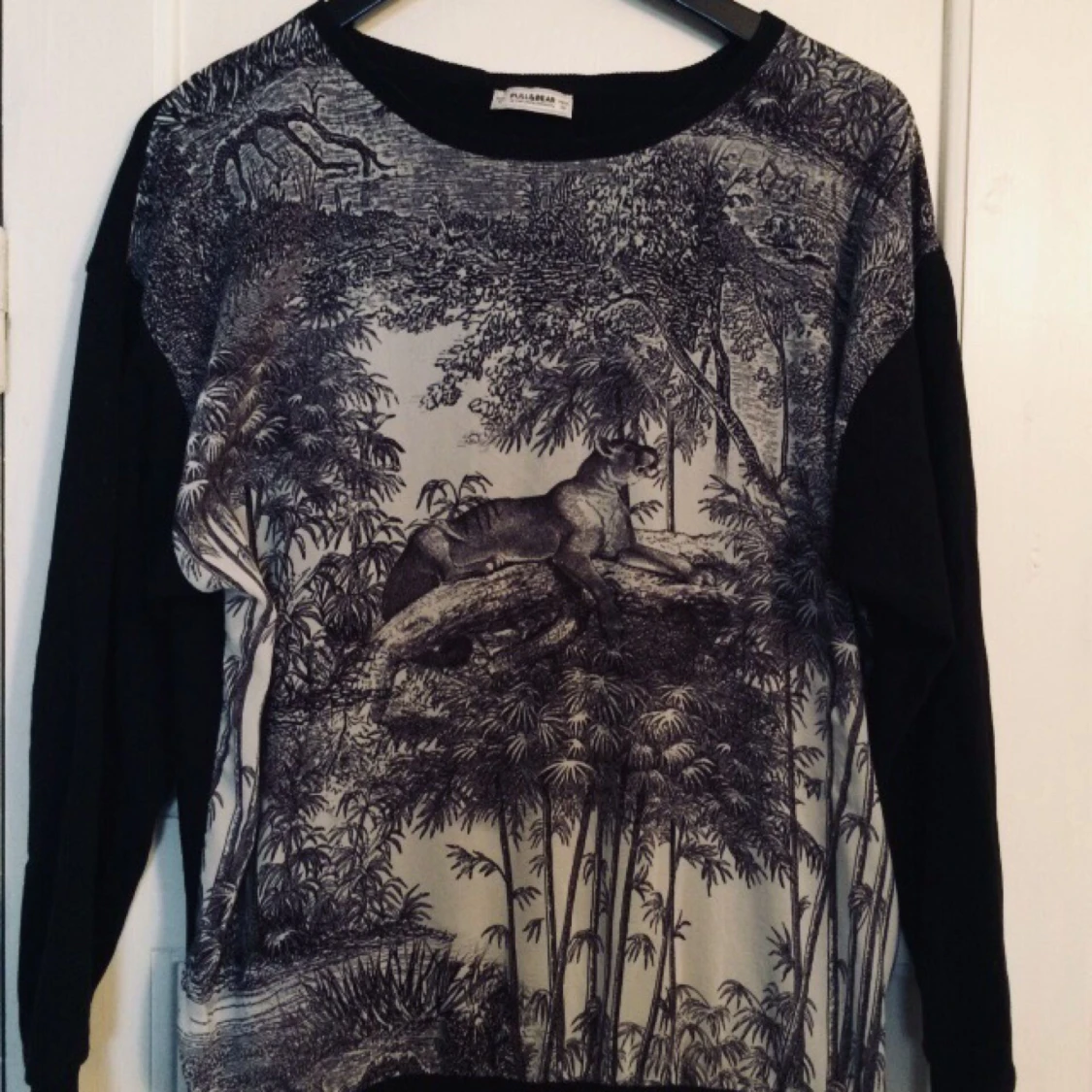 Tröja med mönstrat tryck i lite transparent tyg. Svart baksida i swearshirt trikå. Använd fåtal gånger. Kan mötas upp eller skicka!