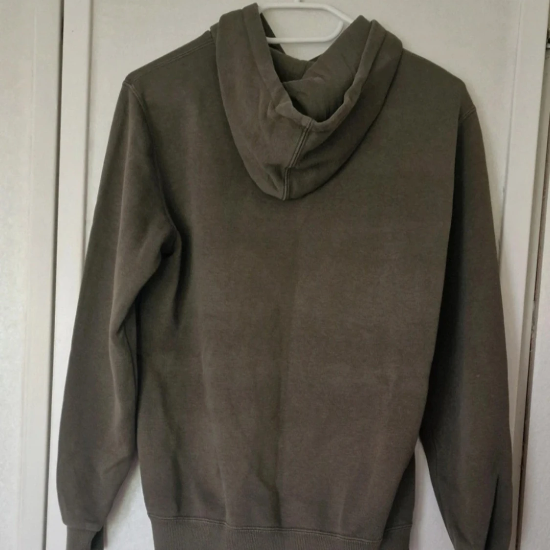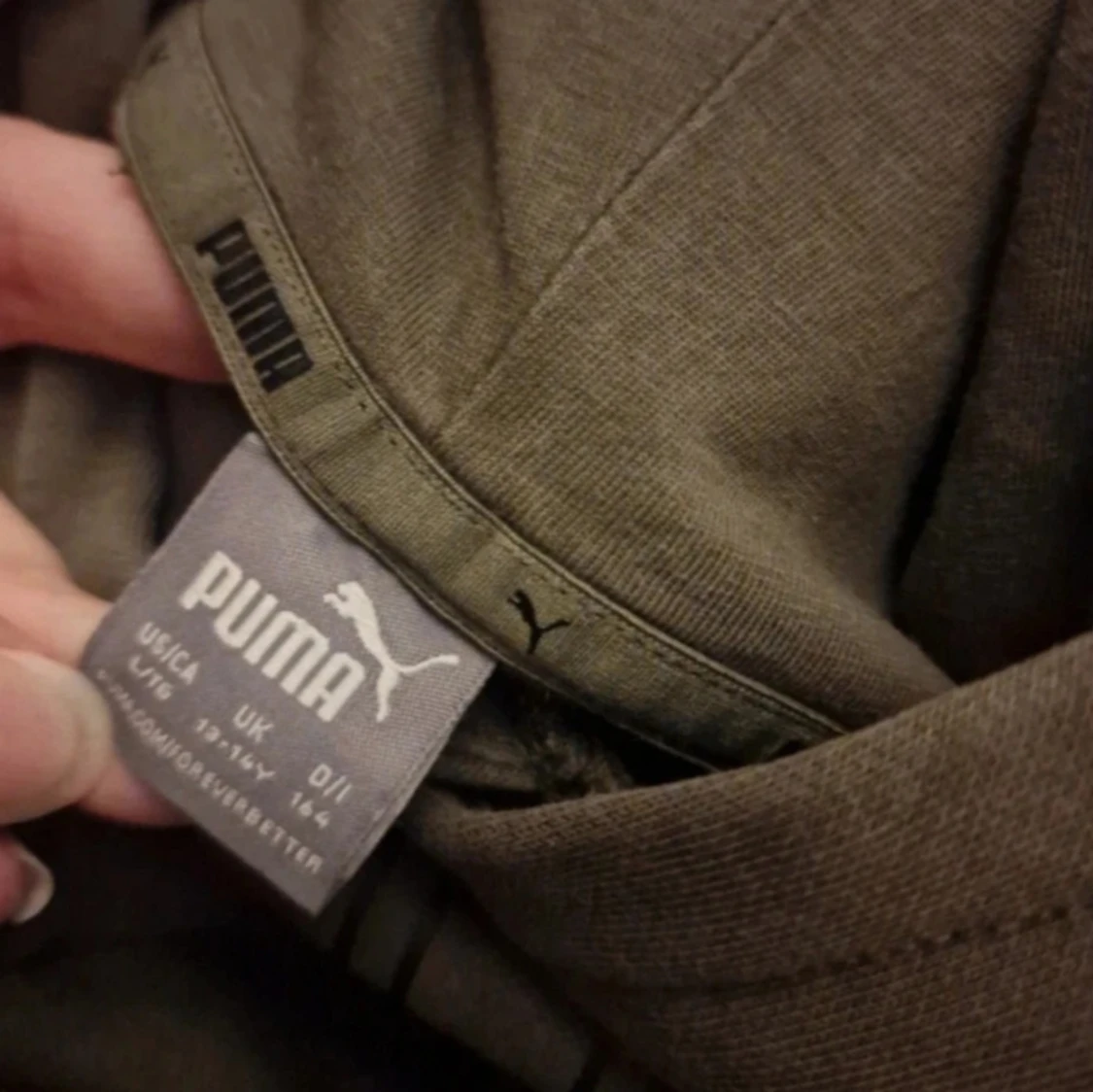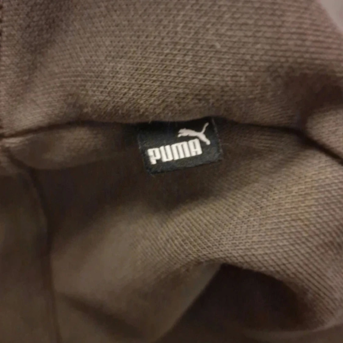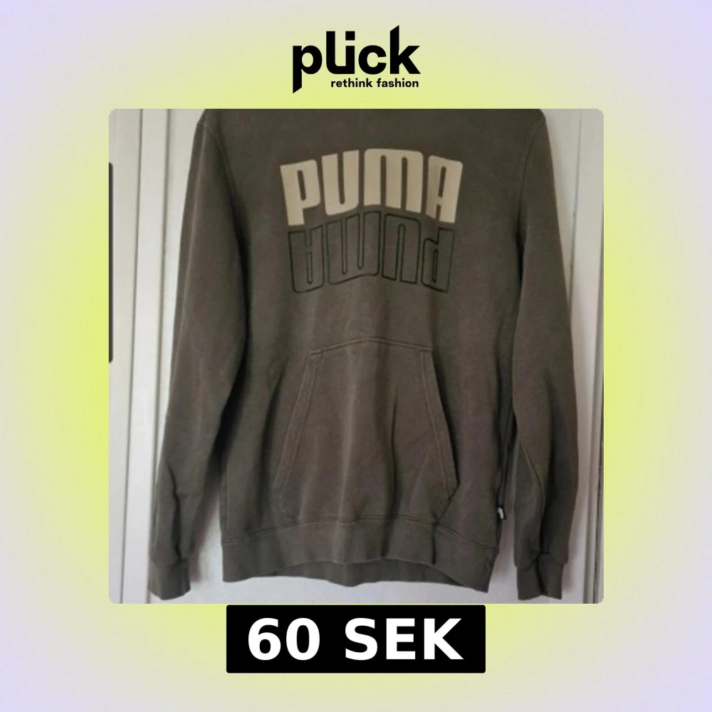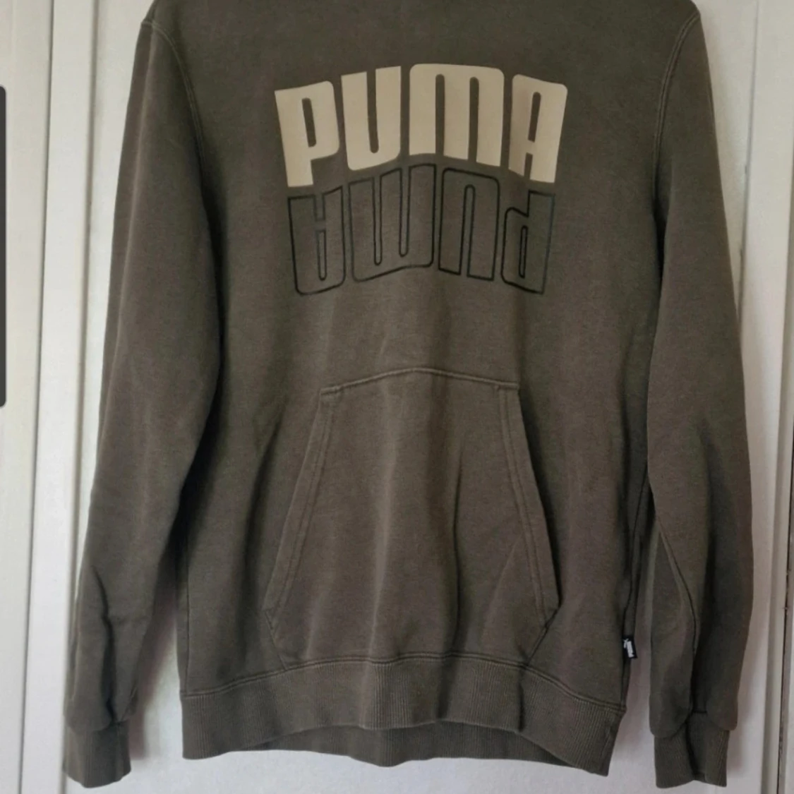 Grön hoodie från Puma med stor logga i beige och svart på bröstet. Klassisk känguruficka framtill, huva och ribbade muddar. Materialet är mjuk bomullsblandning. Det är möjligt att den blivit lite blekt i färgen efter att ha tvättats. Inga andra skavanker vad jag har kunnat se.