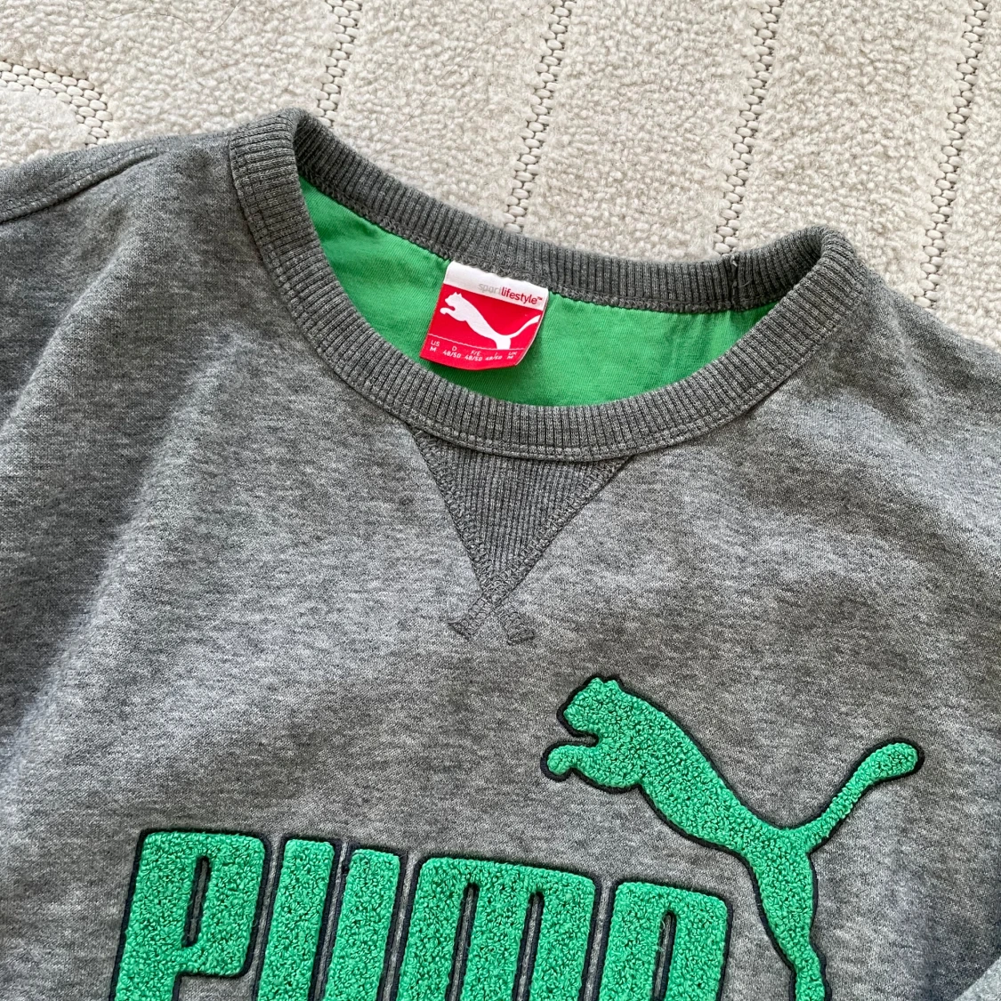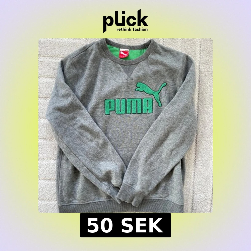 Säljer en grå sweatshirt från Puma med grönt logotryck på bröstet. Tröjan har rund hals och långa ärmar, perfekt för en avslappnad stil. Den är tillverkad i ett mjukt material för extra komfort.