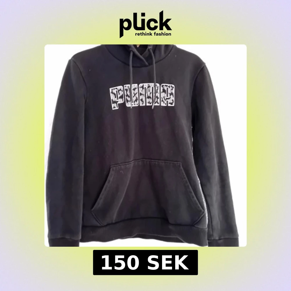 Säljer en svart hoodie från Puma med en stor logga på bröstet. Tröjan har en klassisk känguruficka och justerbar huva med dragsko. Perfekt för en avslappnad stil. 12-13 år!