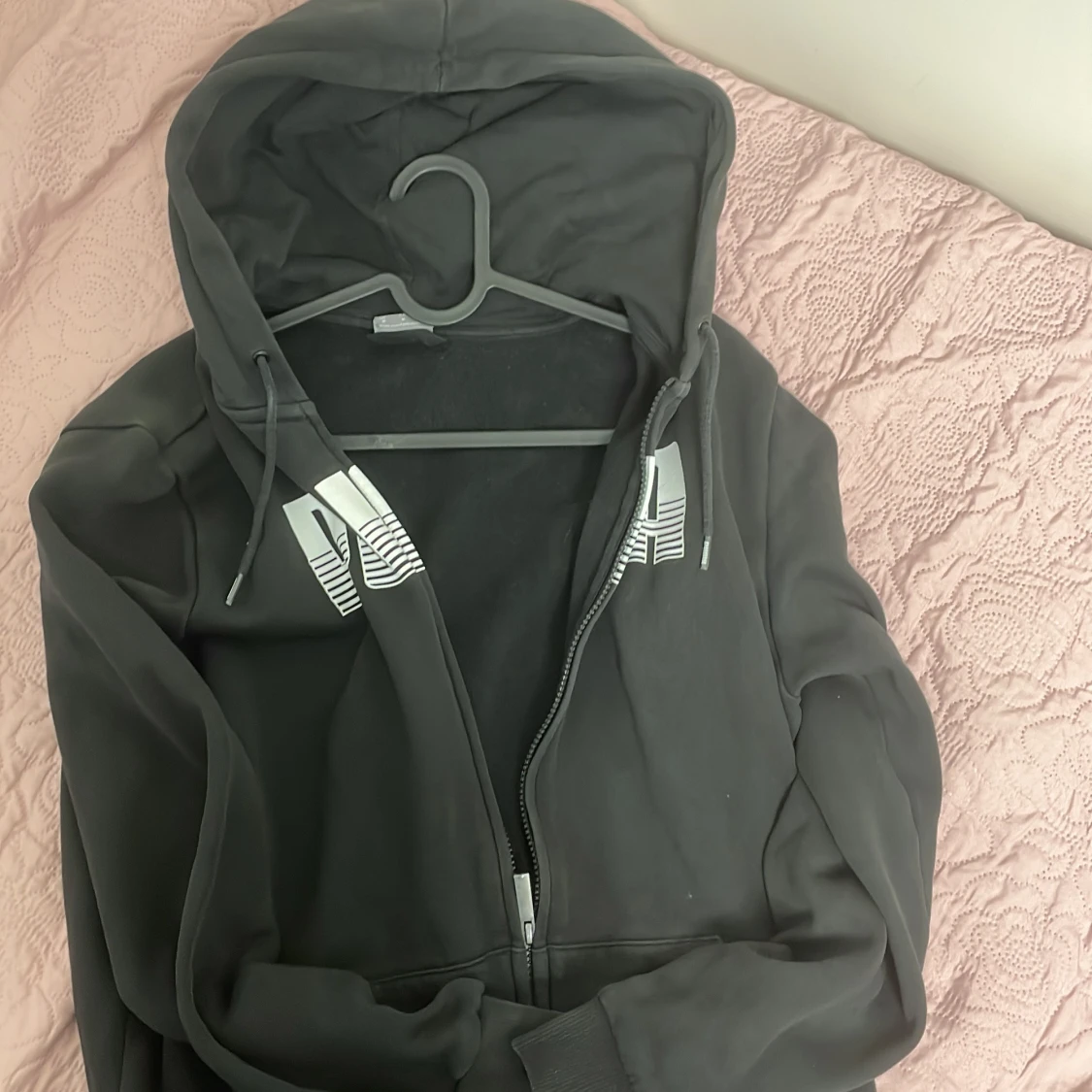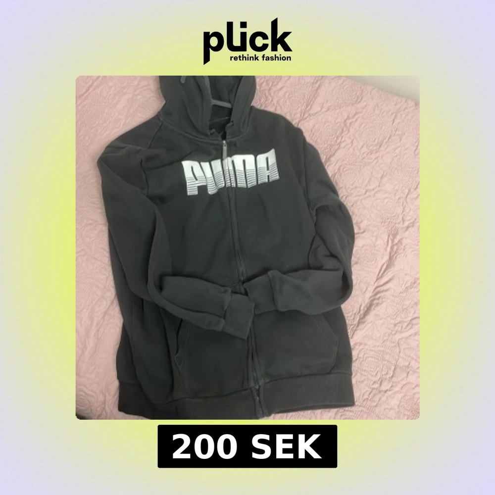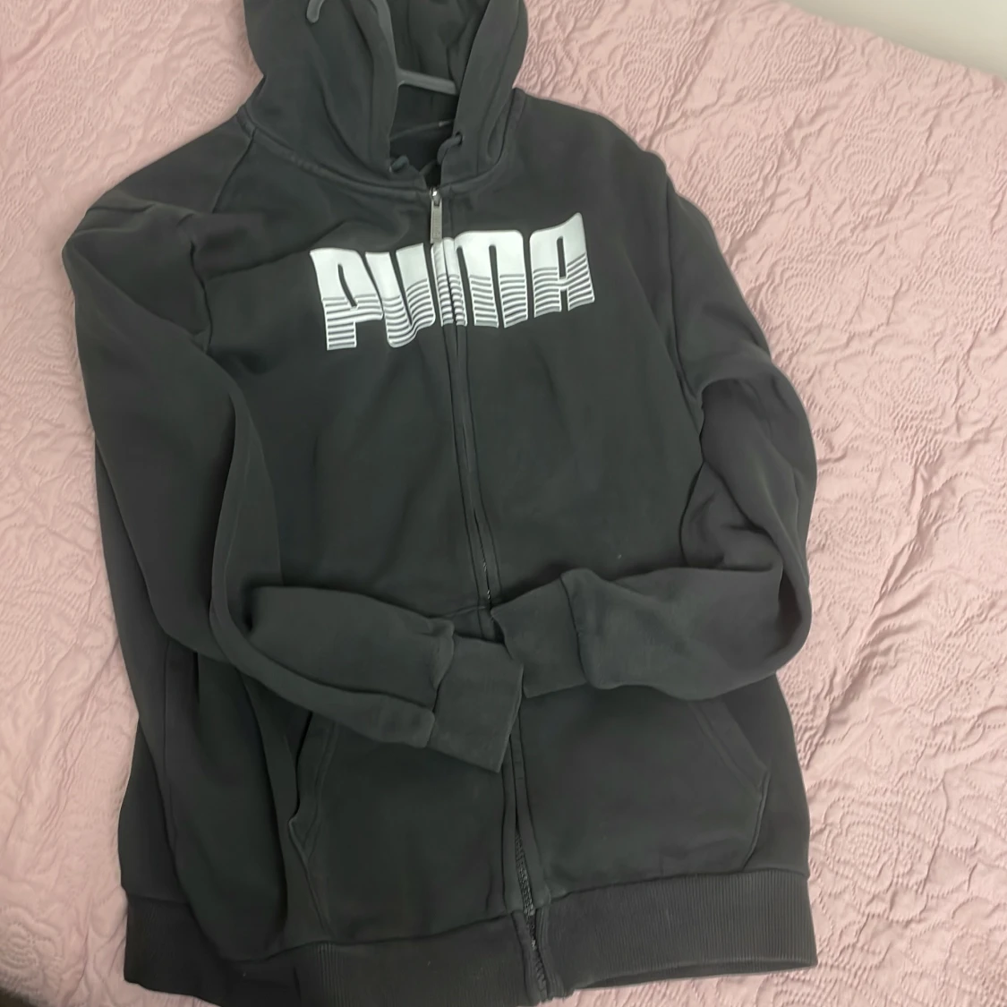 Svart hoodie från Puma med stor vit logga på bröstet. Tröjan har huva med snörning, långa ärmar och praktisk dragkedja framtill. Tillverkad i mjuk bomullsmix, perfekt för chill eller träning. Klassisk och enkel design som funkar till allt. Blev liten på mig så väljer att sälja den för ett bra pris