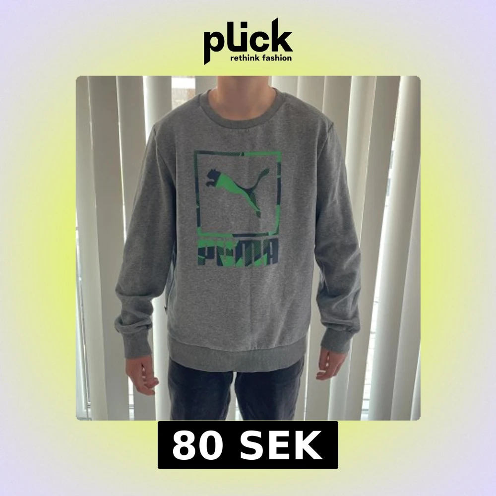 Säljer en grå sweatshirt från Puma med grönt och svart logotryck på framsidan. Tröjan har långa ärmar och en rund halsringning. Perfekt för en avslappnad stil och göra din outfit mer soft och snygg ✅