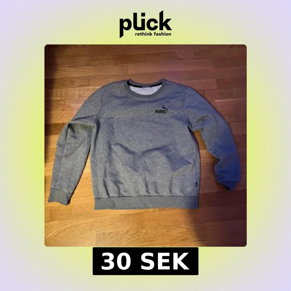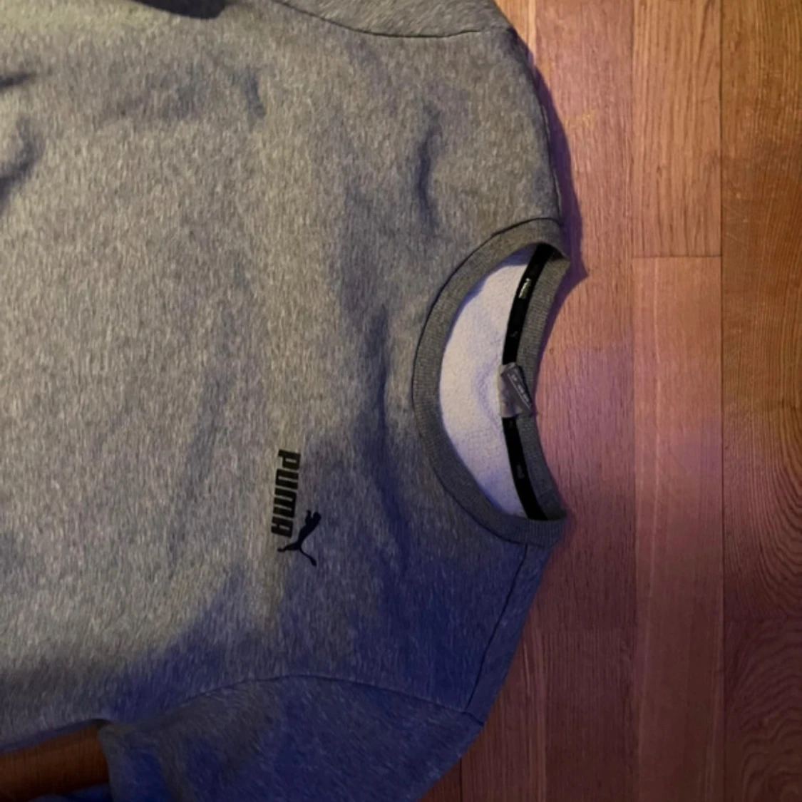 Säljer en stilren grå sweatshirt från Puma med svart logga på bröstet. Tröjan har rund halsringning, långa ärmar och ribbade muddar vid ärmslut och nederkant. Perfekt för en chill och sportig look.