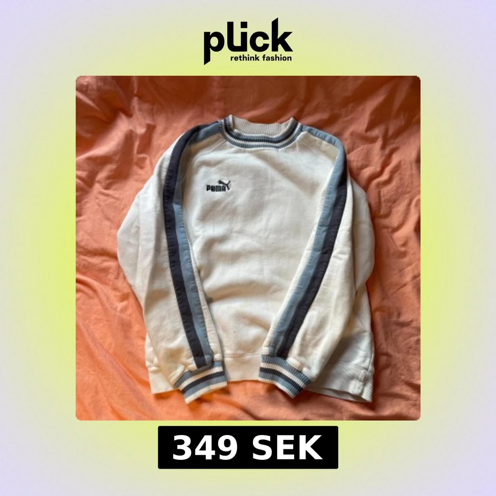 Säljer en vit tröja från Puma med blå ränder längs ärmarna och ribbade muddar. Tröjan har en klassisk design med rund hals och Puma-logga på bröstet. Perfekt för en avslappnad stil. En mindre fläck som syns på sista bilden.