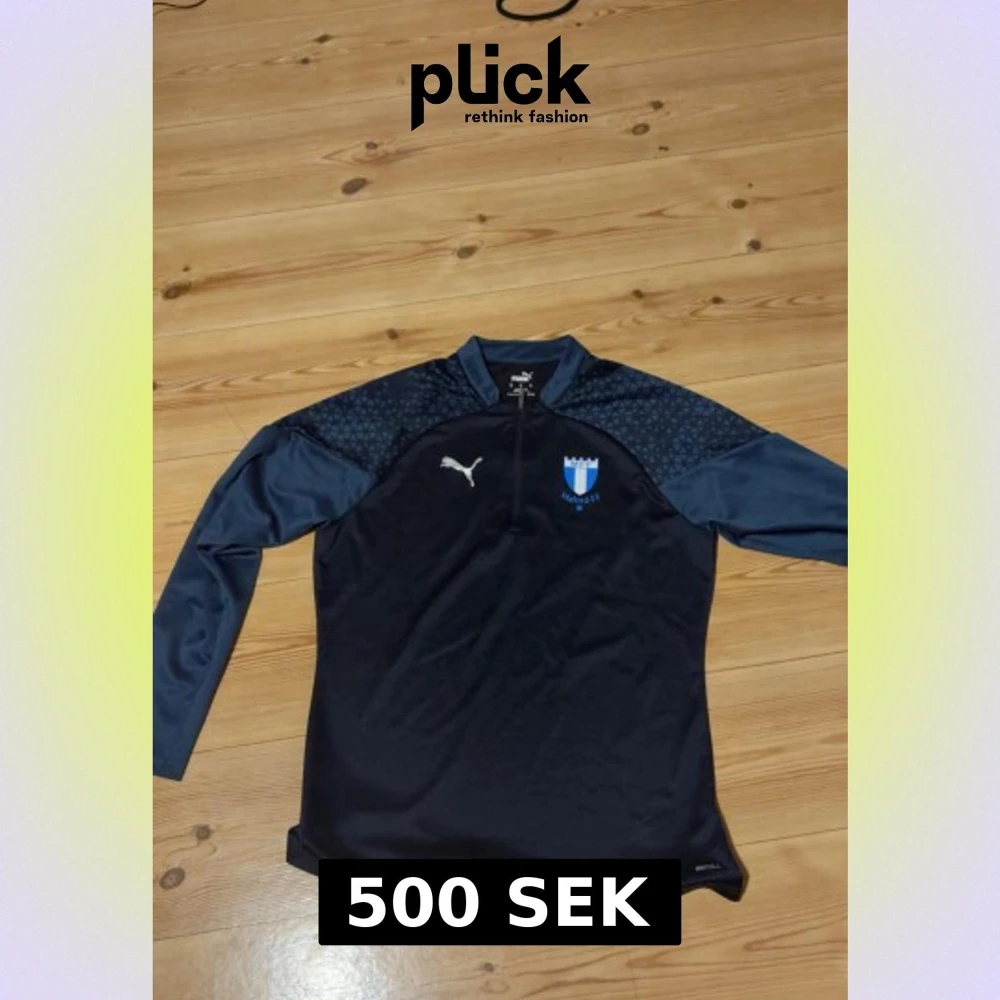 OANDVÄND. Snygg långärmad fotbollströja från Puma med Malmö FF-logga på bröstet. Tröjan är mörkblå med ljusblå detaljer och har ett subtilt geometriskt mönster på axlarna. Materialet är funktionellt och andas, perfekt för träning. Halv dragkedja framtill.