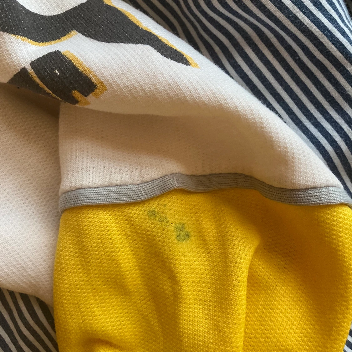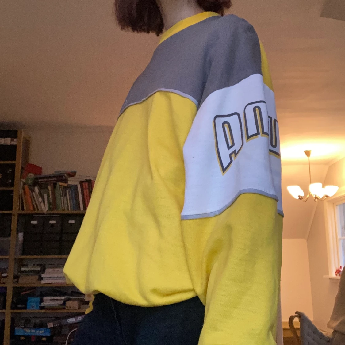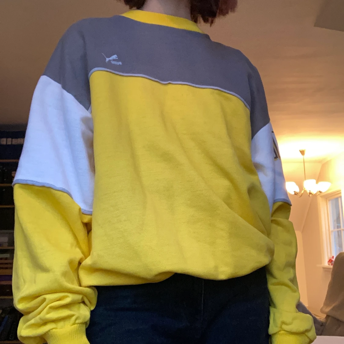 đGul vintage Puma sweatshirt med vita och grĂ„a detaljerđ Den har en dĂ„v fĂ€rgflĂ€ck pĂ„ vĂ€nster Ă€rmđ