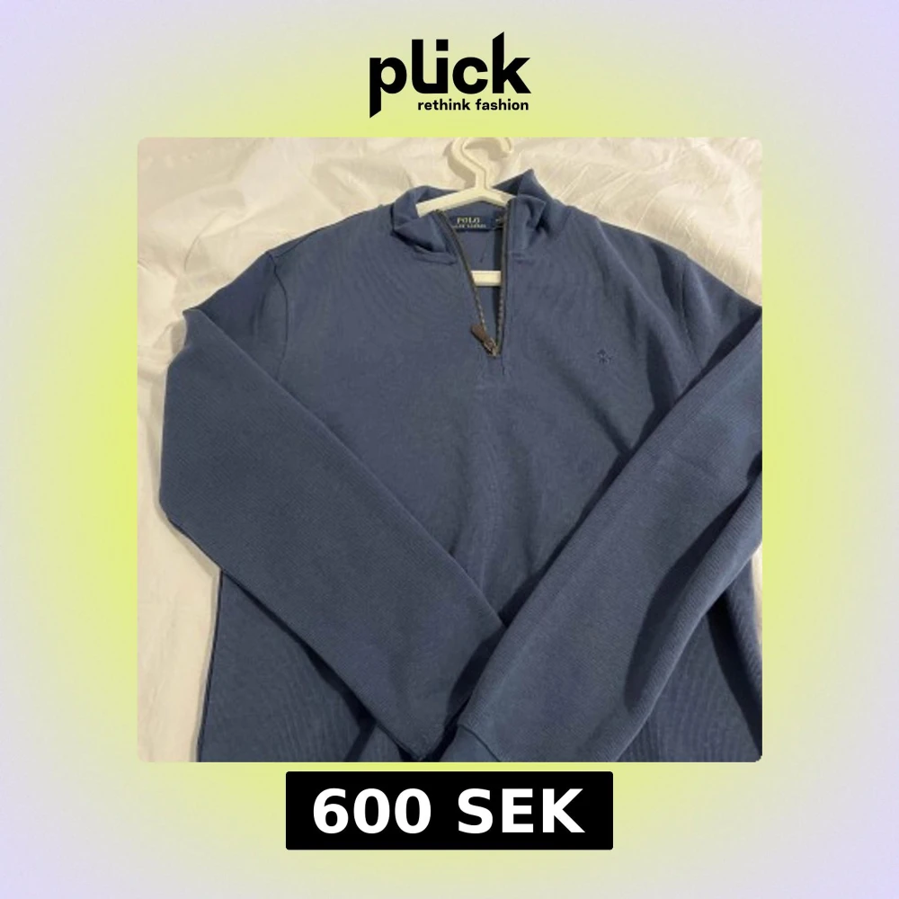 Snygg blå tröja från Polo Ralph Lauren med dragkedja vid halsen. Tröjan har långa ärmar och en diskret ribbad struktur. Perfekt för en stilren och avslappnad look. Helt ny inga defekter. Storlek M men passar mer som S/M