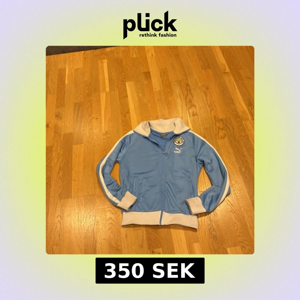 Ljusblå ziptröja från Puma med Manchester City-logga på bröstet. Tröjan har vita detaljer på krage, ärmslut och midja samt vita ränder längs ärmarna. Perfekt för fotbollsfans som vill ha en sportig och snygg look.