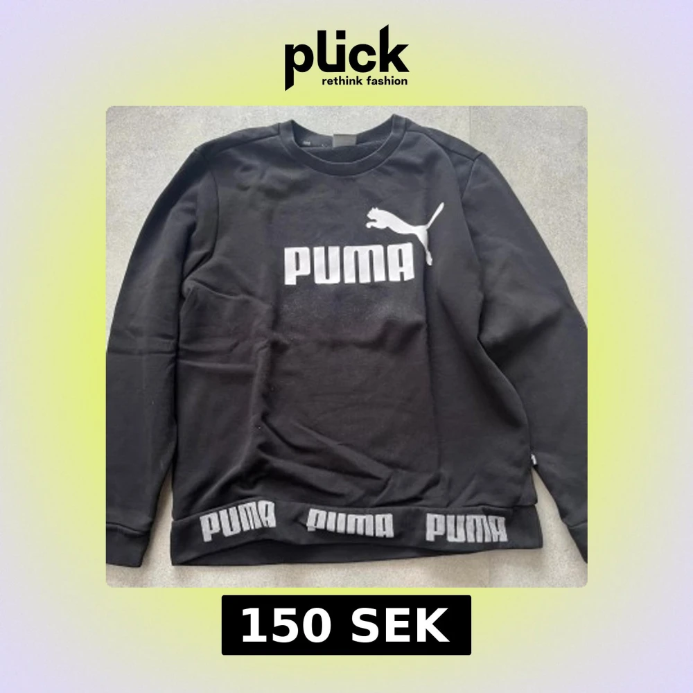 Svart sweatshirt från Puma med stor vit logga och text på bröstet samt upprepade Puma-tryck längs nederkanten. Klassisk rund hals och långa ärmar. Perfekt för en sportig och avslappnad stil.