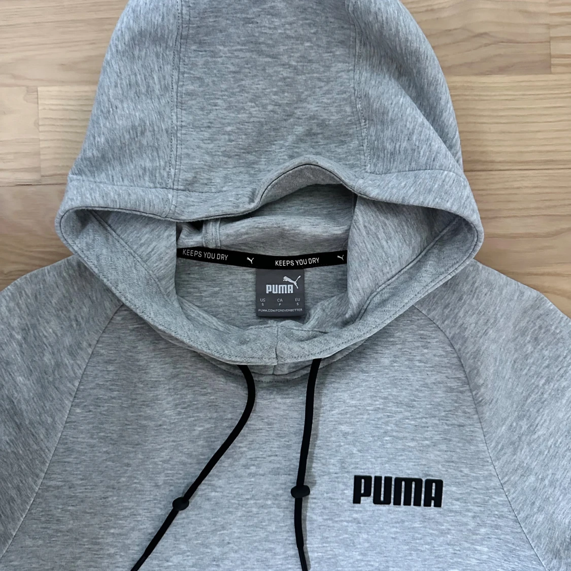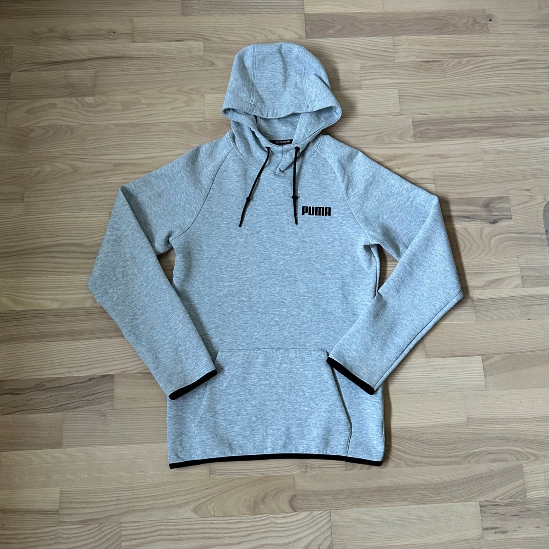 Snygg ljusgrå hoodie från Puma med svart logga på bröstet. Tröjan har huva med svarta snören och en klassisk känguruficka framtill. Tillverkad i mjuk polyesterblandning, perfekt för chill eller träning. Långärmad och stilren design.