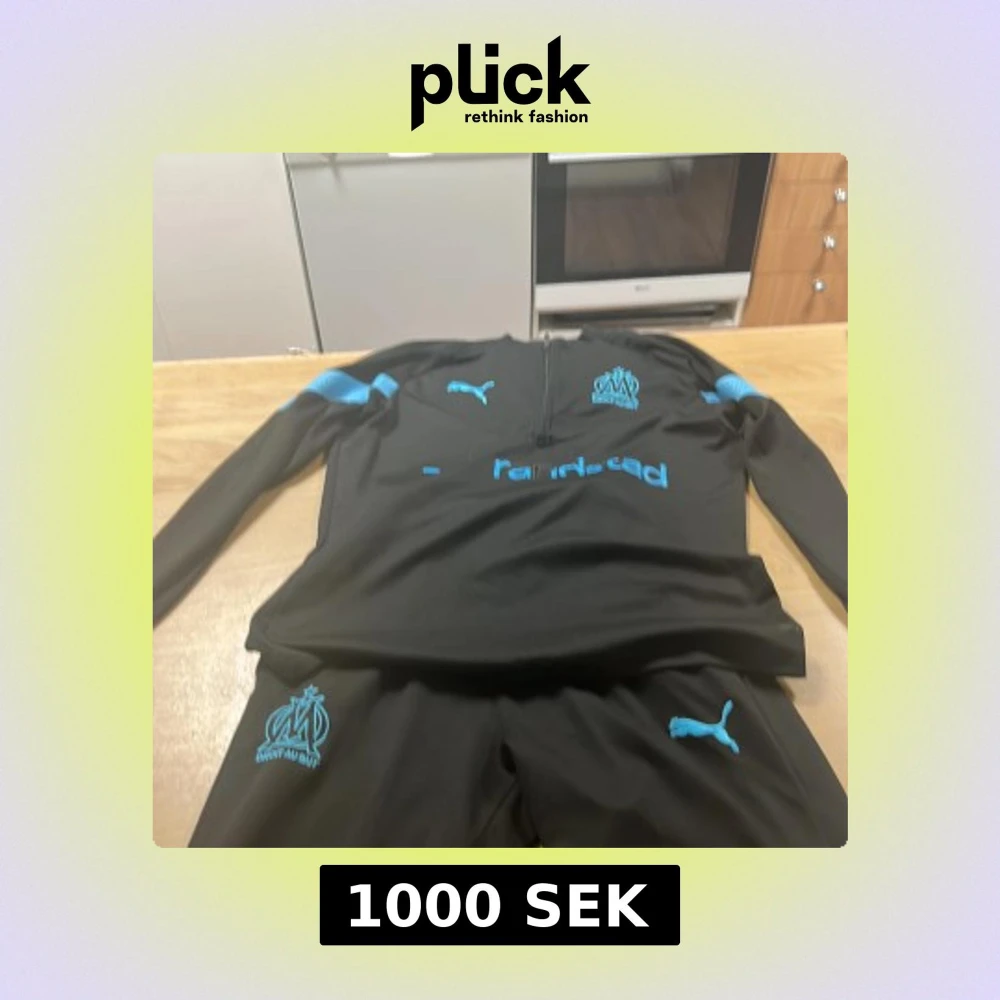 Svart långärmad träningströja från Puma med Olympique de Marseille-logga och blå detaljer. Half zip framtill, blå tryck på bröst och ärmar samt Randstad-sponsor. Perfekt för fotbollsträning eller chill. Matchande byxor medföljer ej.