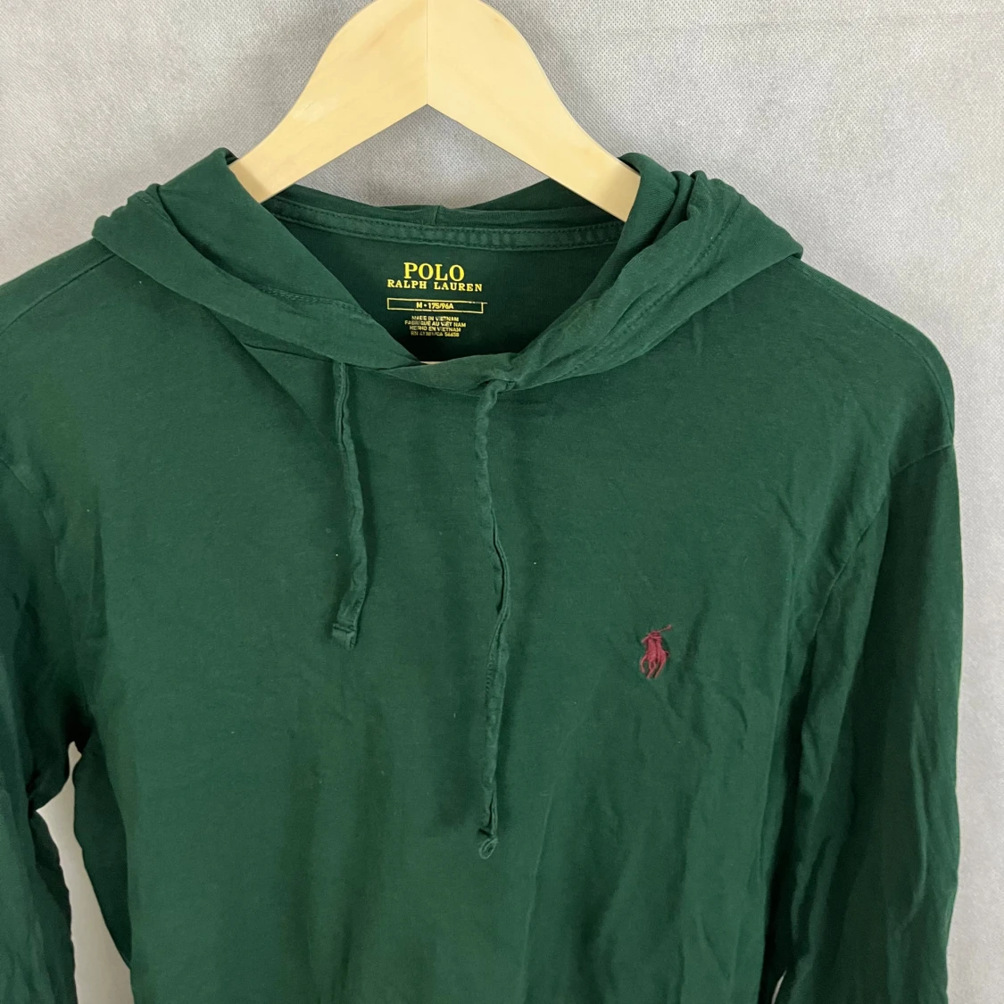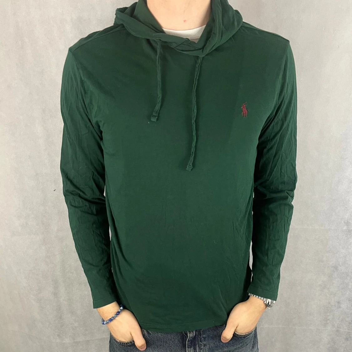 Mörkgrön hoodie från Polo Ralph Lauren med klassisk huva och snörning. Tröjan har lång ärm och är tillverkad i mjuk bomull. Diskret röd logga broderad på bröstet. Perfekt för en chill och stilren look. Storlek S, modellen är 185