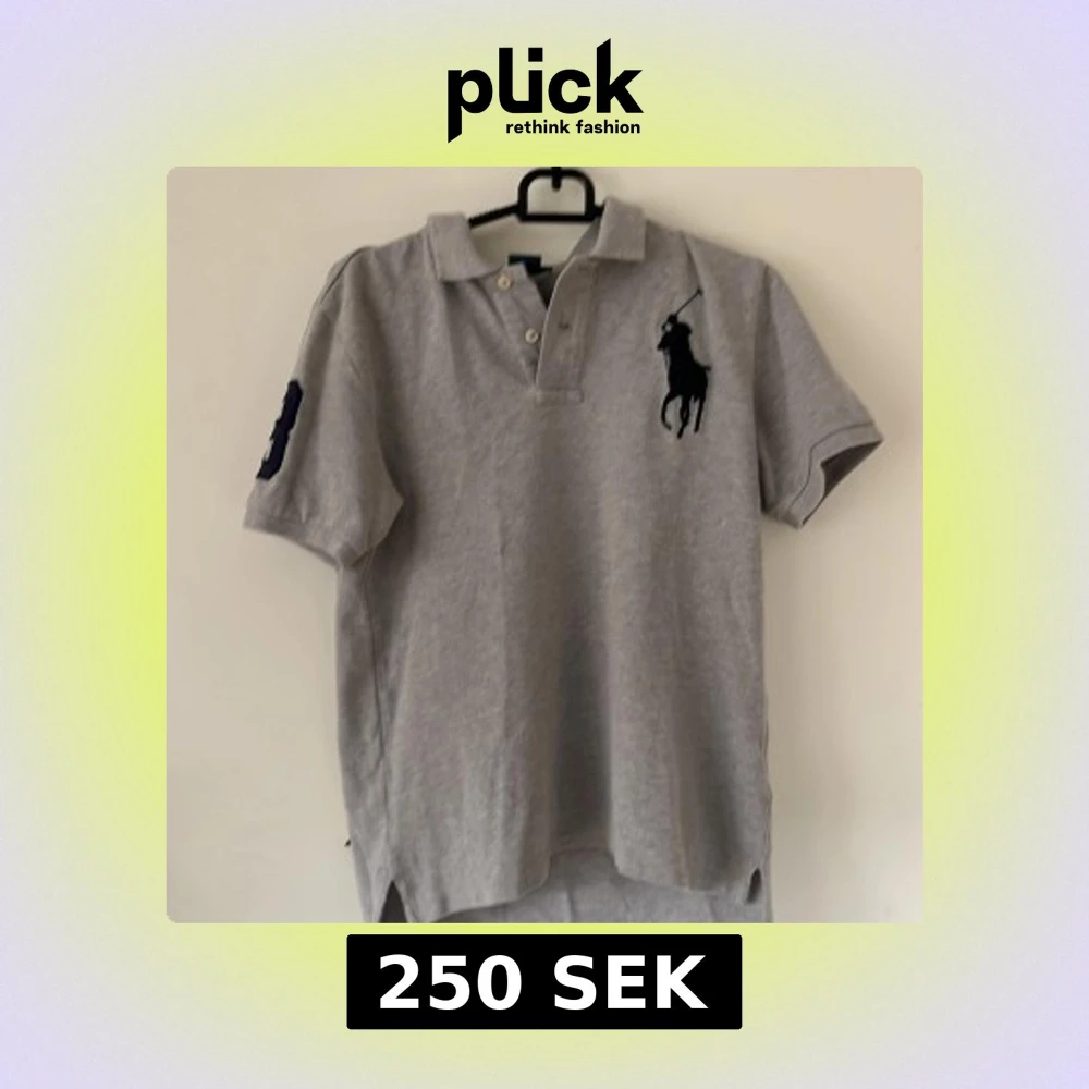 Säljer en klassisk grå pikétröja från Ralph Lauren med korta ärmar. Tröjan har en stor broderad logga på bröstet och en siffra på ärmen. Perfekt för en stilren och avslappnad look. Passar ungefär till 12-14 åringar. Prisa kan diskuteras !