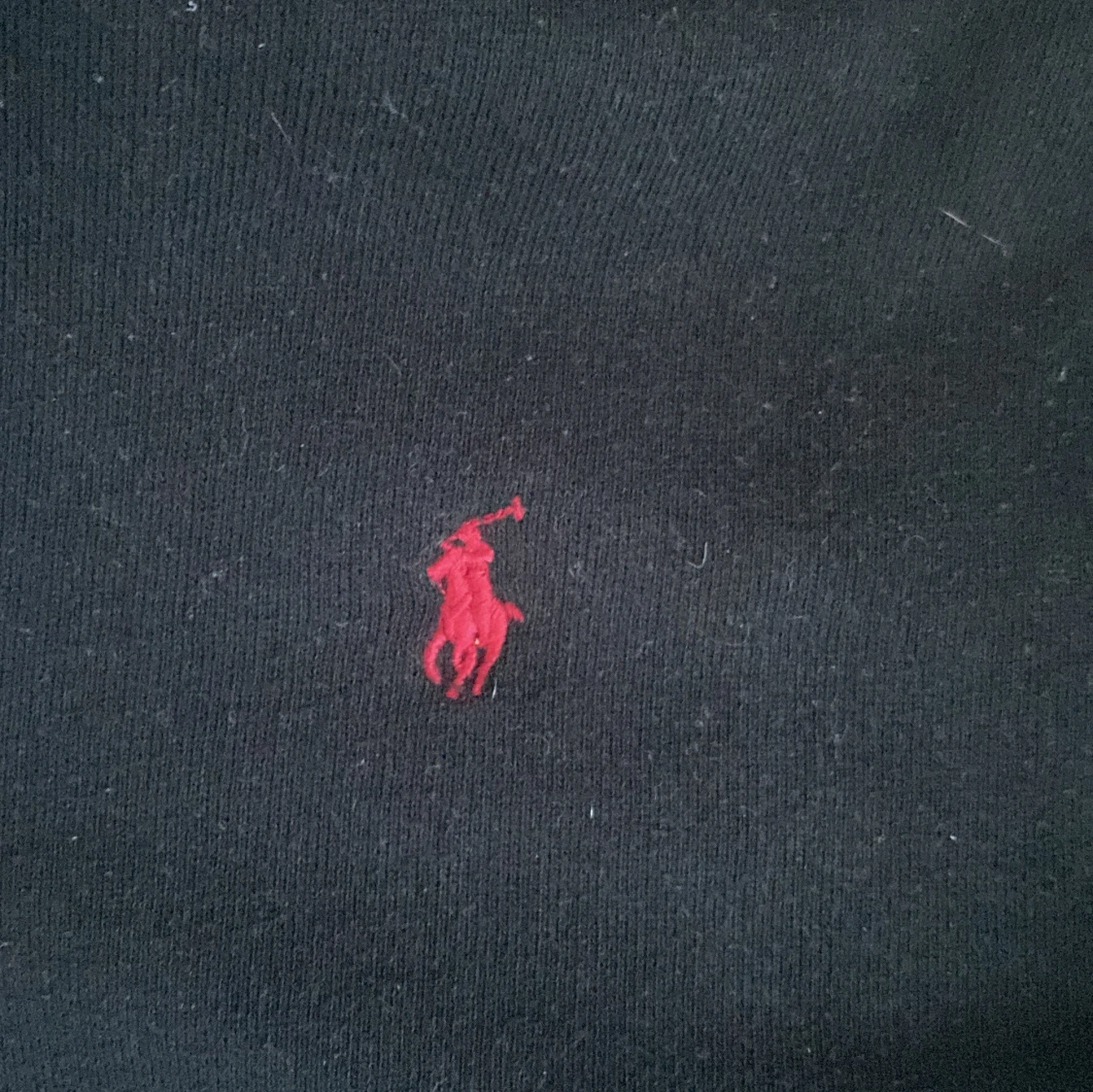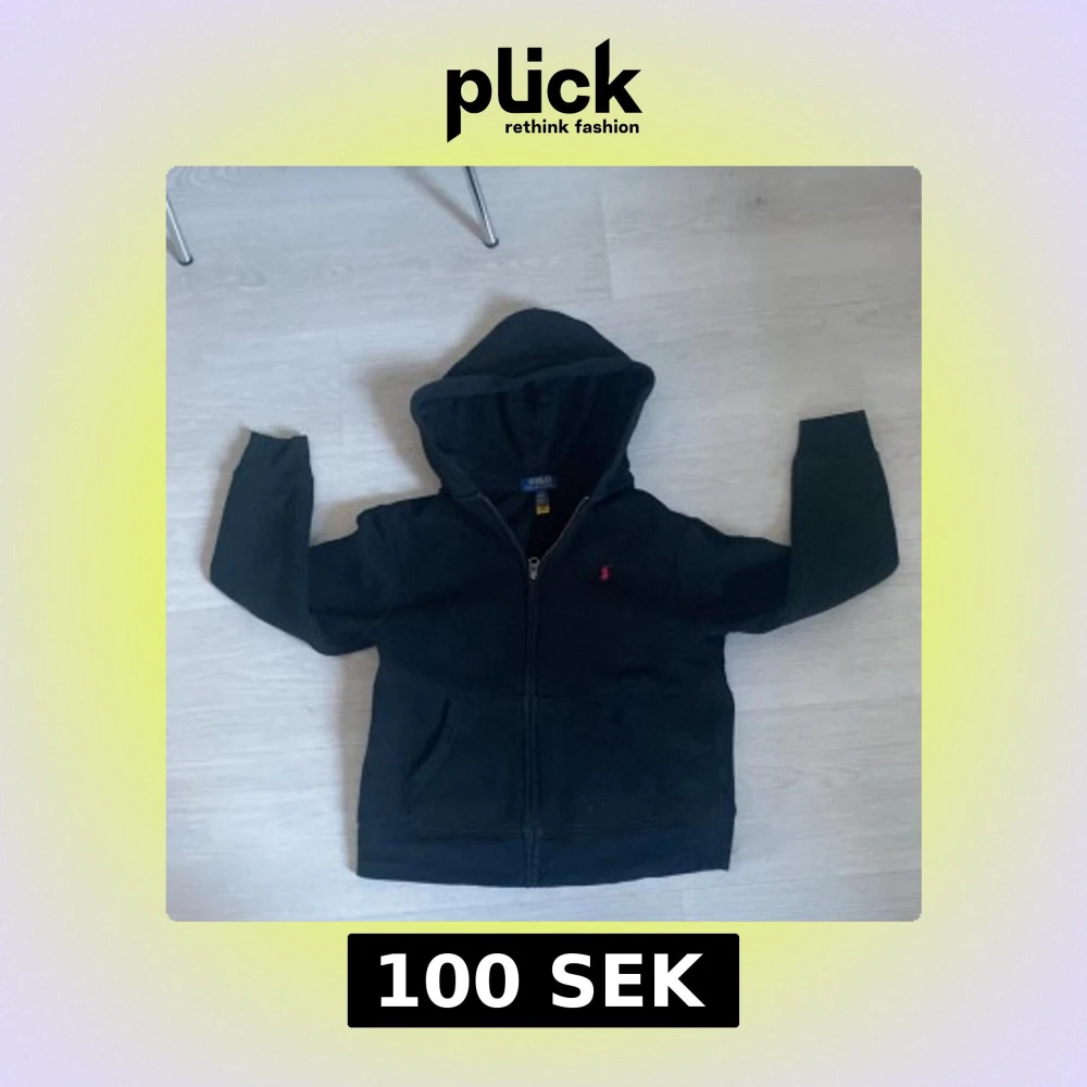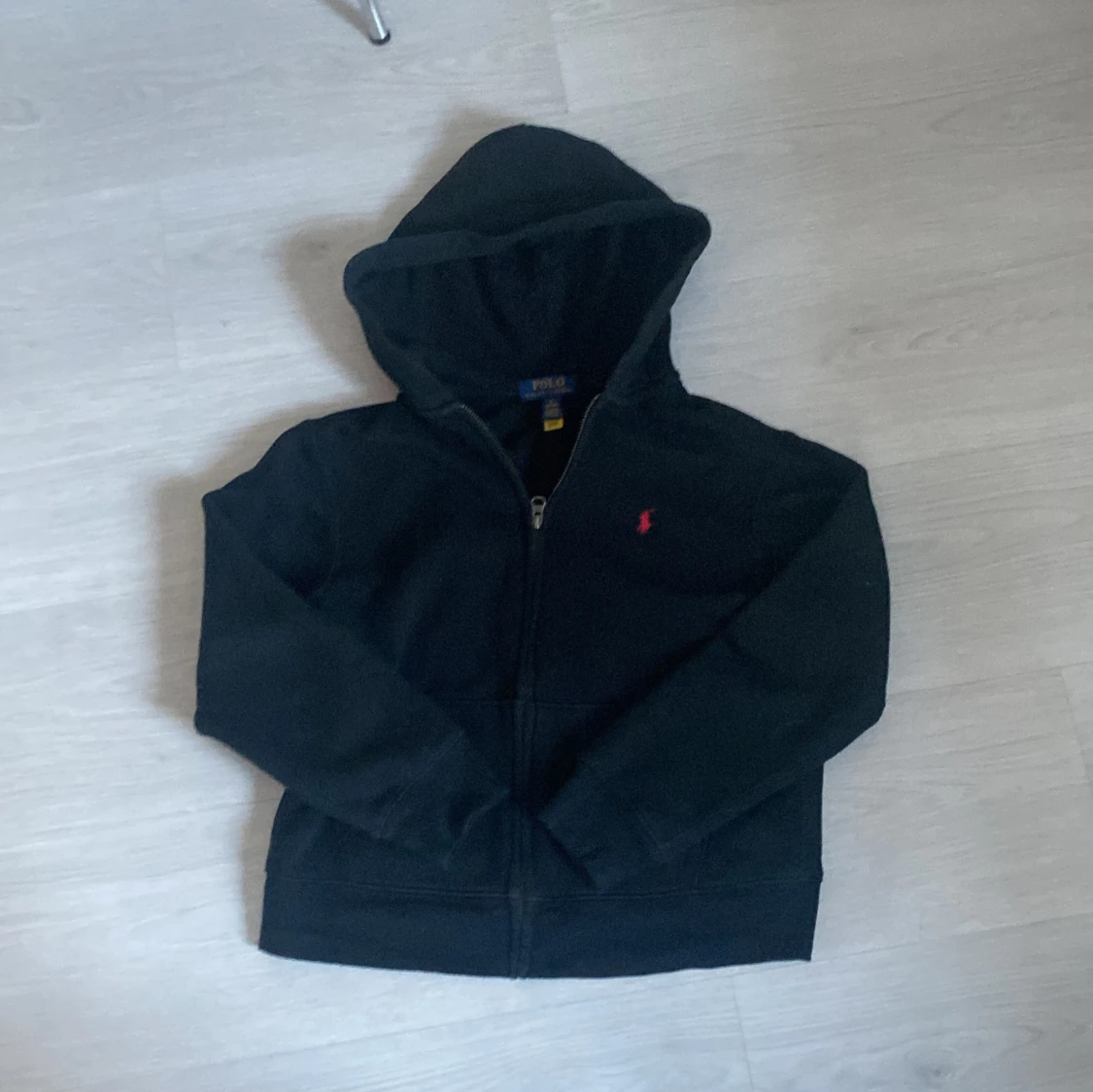 Säljer en klassisk svart hoodie från Ralph Lauren med dragkedja och huva. Den har en liten röd broderad logga på bröstet. Perfekt för en stilren och bekväm look.
