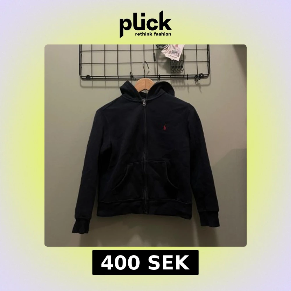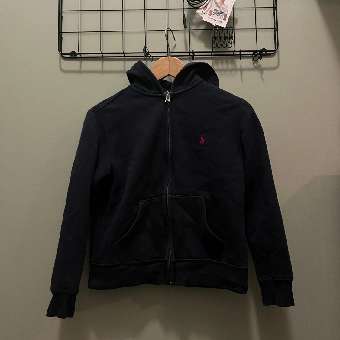 Marinblå hoodie från Polo Ralph Lauren med dragkedja framtill och huva. Tröjan har två fickor och ett litet rött broderat Polo-logo på bröstet. Perfekt för chill dagar och enkel att matcha med jeans eller joggers.
