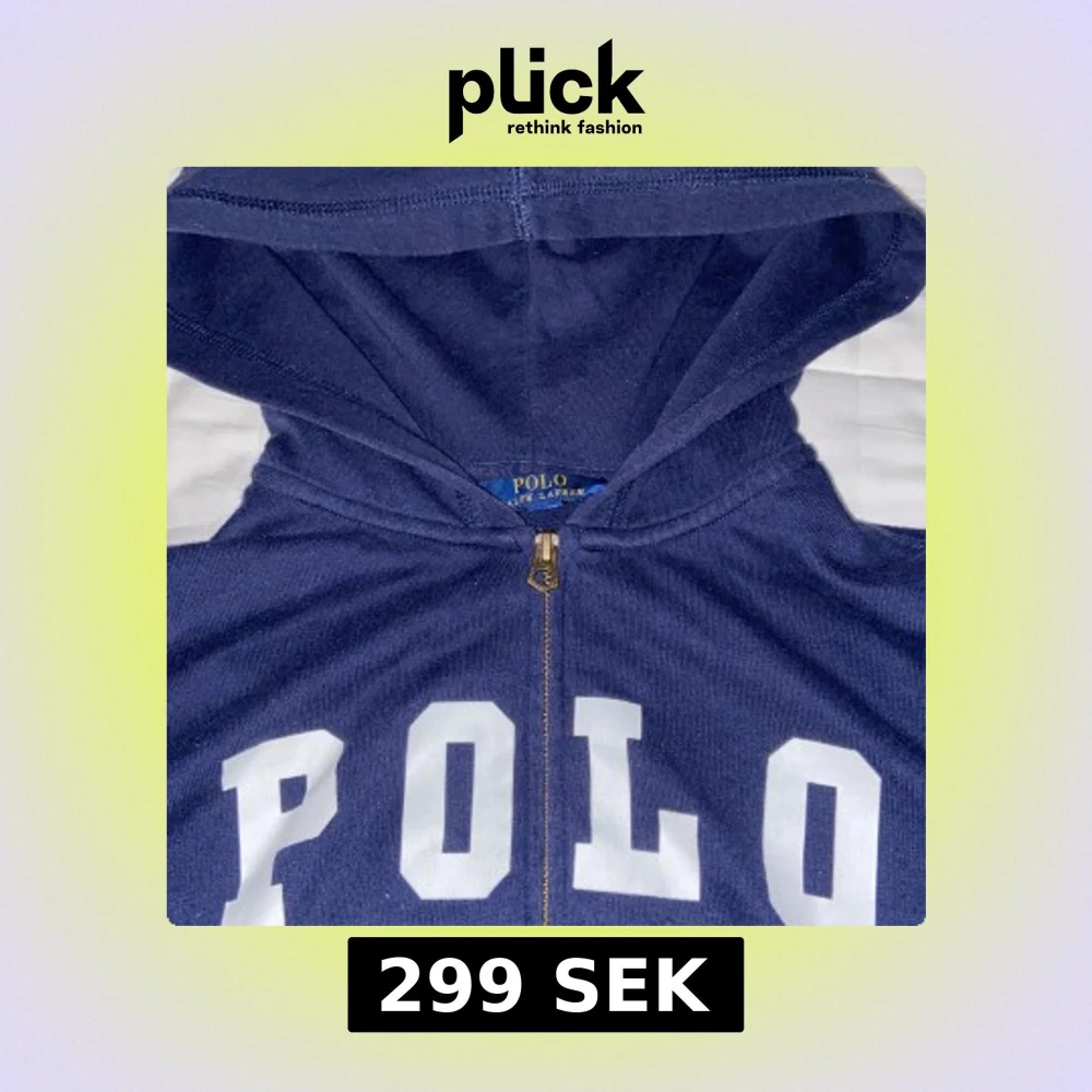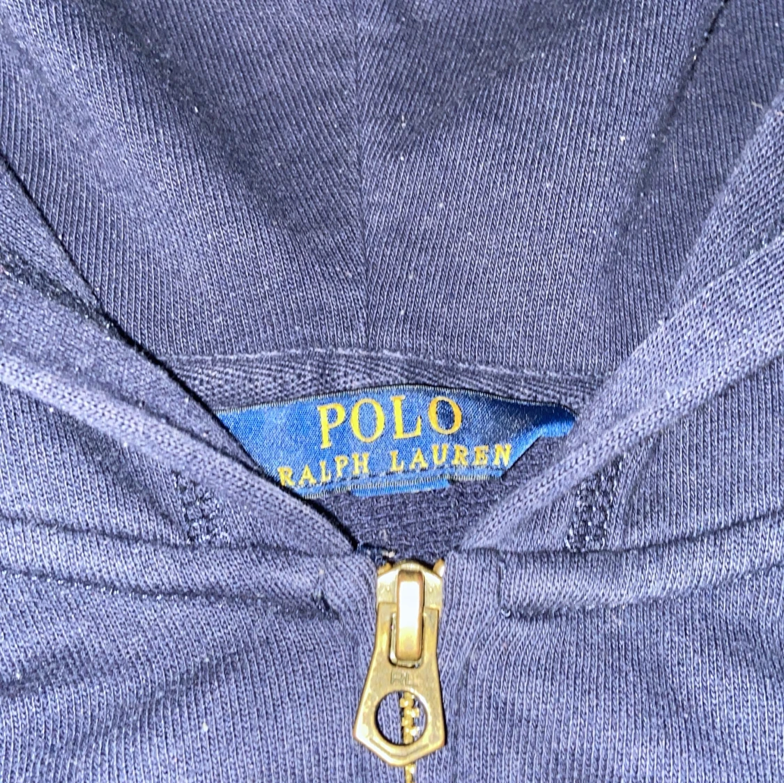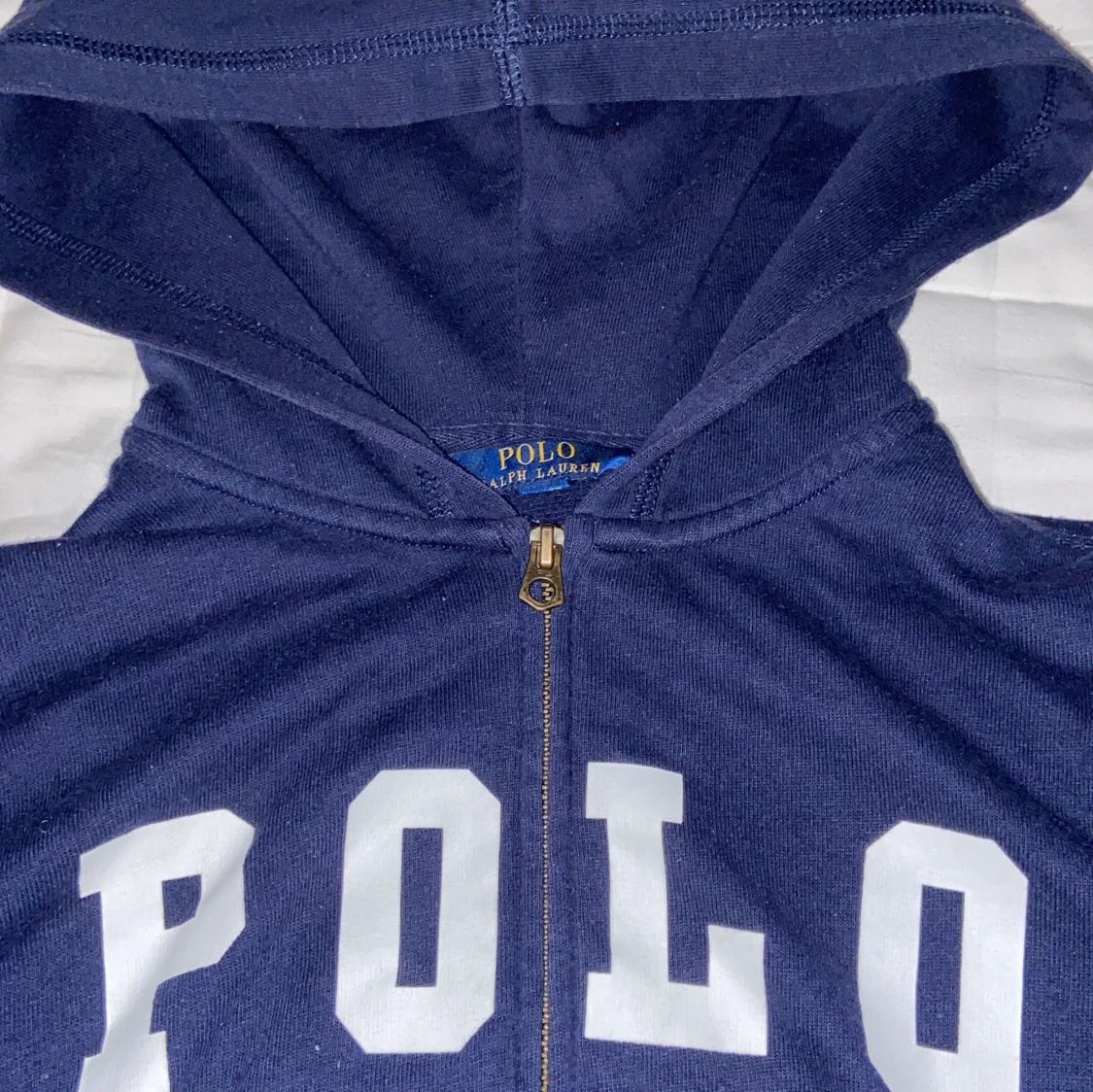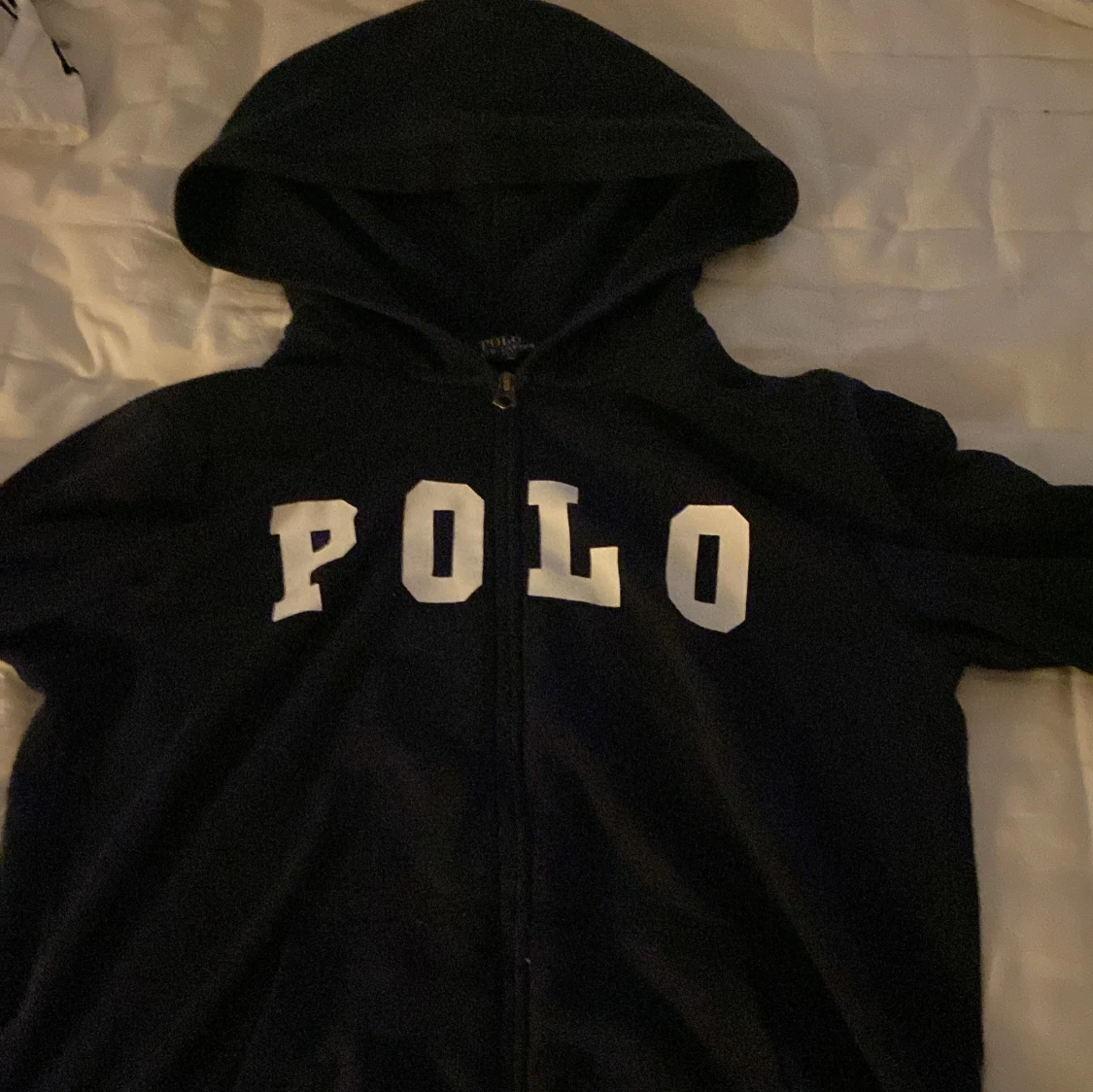 Säljer en mörkblå hoodie från Polo Ralph Lauren med stor vit POLO-text på bröstet. Tröjan har huva, dragkedja framtill och är tillverkad i mjuk bomull. Perfekt för chill dagar och har en klassisk streetwear-vibe.