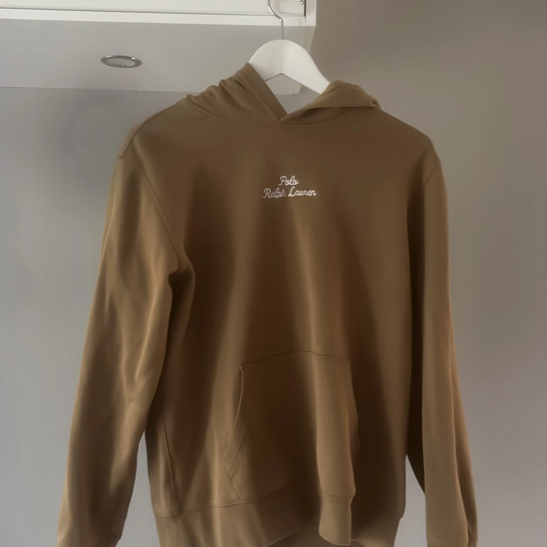 Snygg beige hoodie från Polo Ralph Lauren med broderad logga på bröstet. Tröjan har huva, känguruficka och långa ärmar. Perfekt för chill dagar och enkel att matcha med jeans eller joggers.