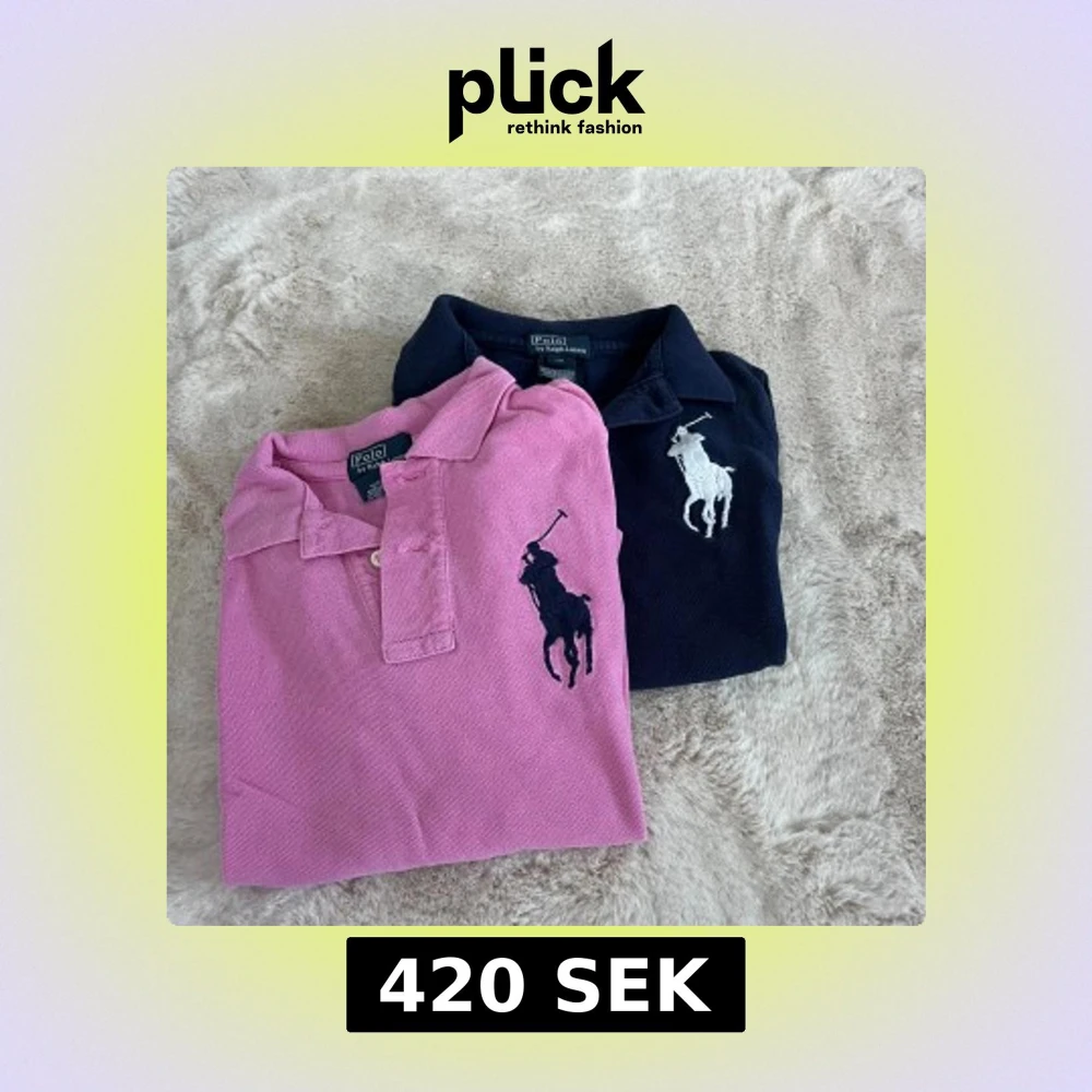 Två klassiska pikétröjor från Polo Ralph Lauren i bomull. En är rosa med stor svart broderad logga, den andra är mörkblå med vit broderad logga. Båda har krage, knappar och kort ärm – perfekta för en clean och sportig look. Köp en för 250 eller båda för 420.