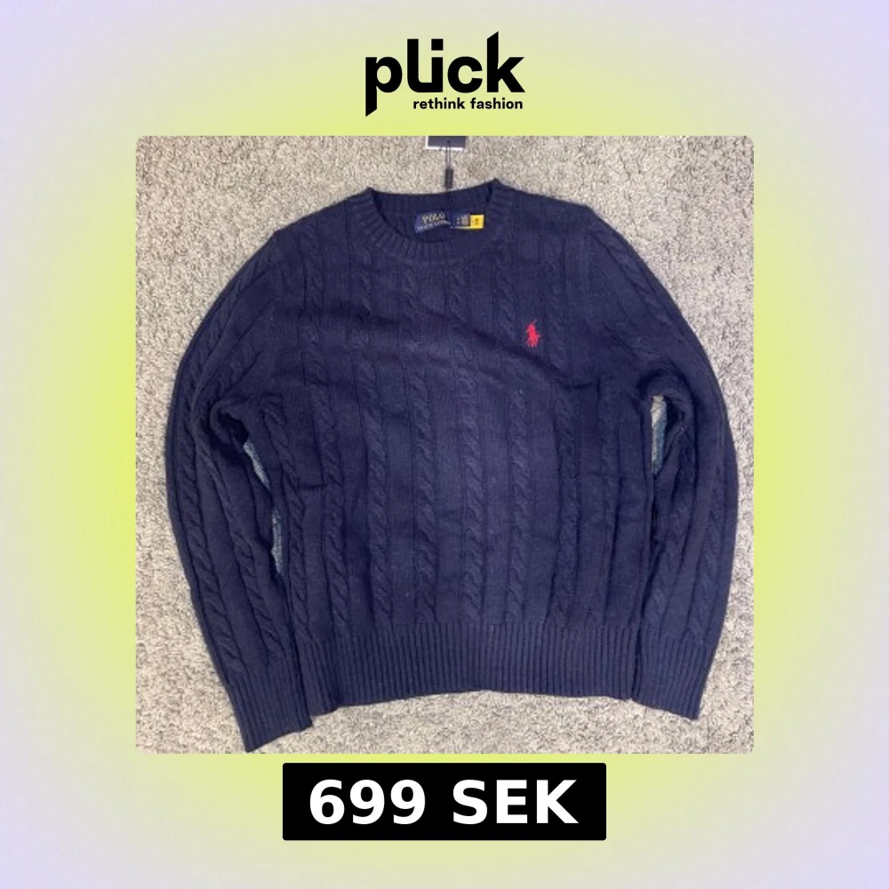 Kabelstickad marinblå tröja från Polo Ralph Lauren med klassisk röd broderad logga på bröstet. Rund hals, ribbade muddar och långärmad modell. Perfekt för dig som gillar stilrena och tidlösa plagg med premiumkänsla. Den är i storlek S och aldrig använd den sticks inte.