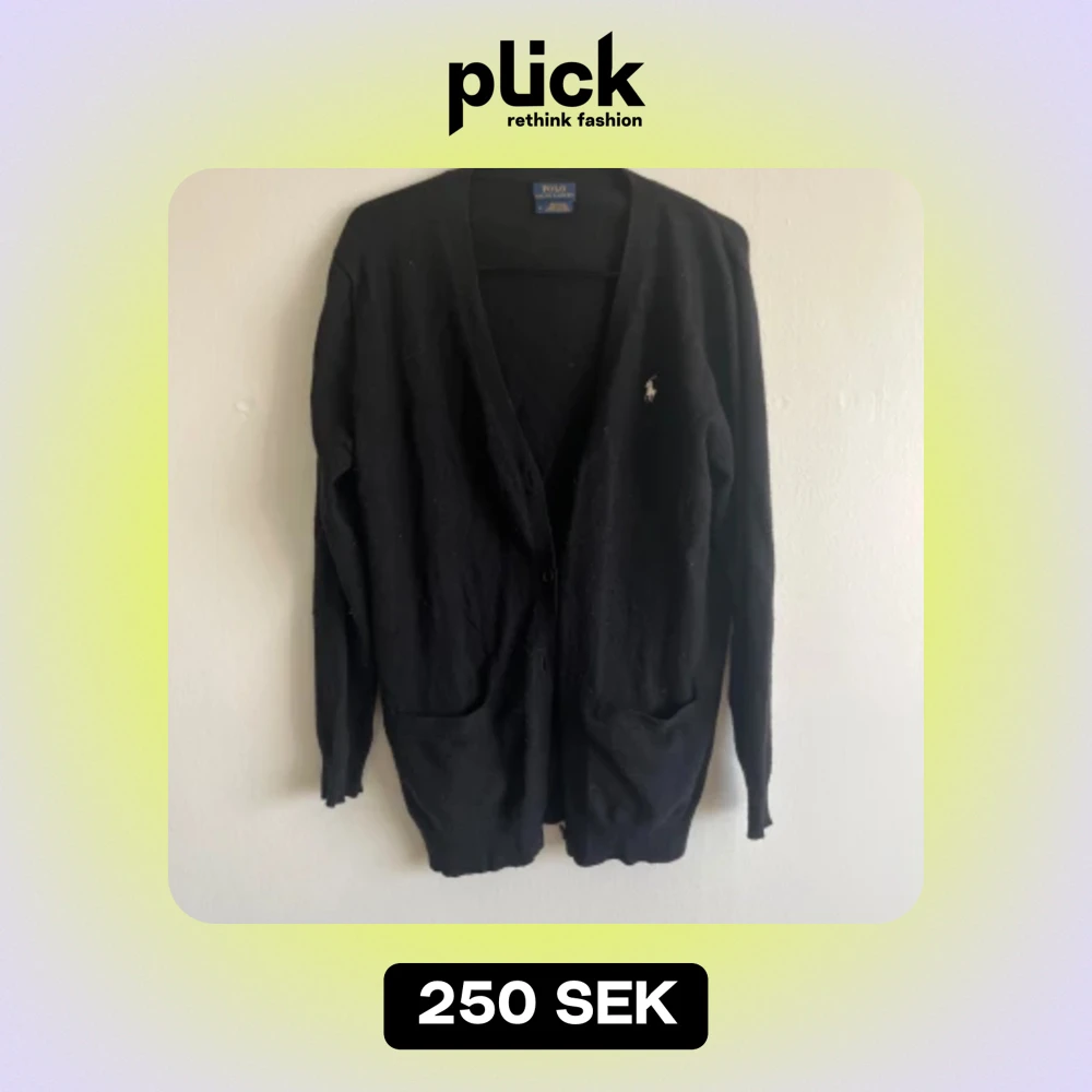 Svart tunnstickad kofta från Ralph Lauren. Tecken på användning finns men fortfarande i fint skick. Passar allt från XS-M