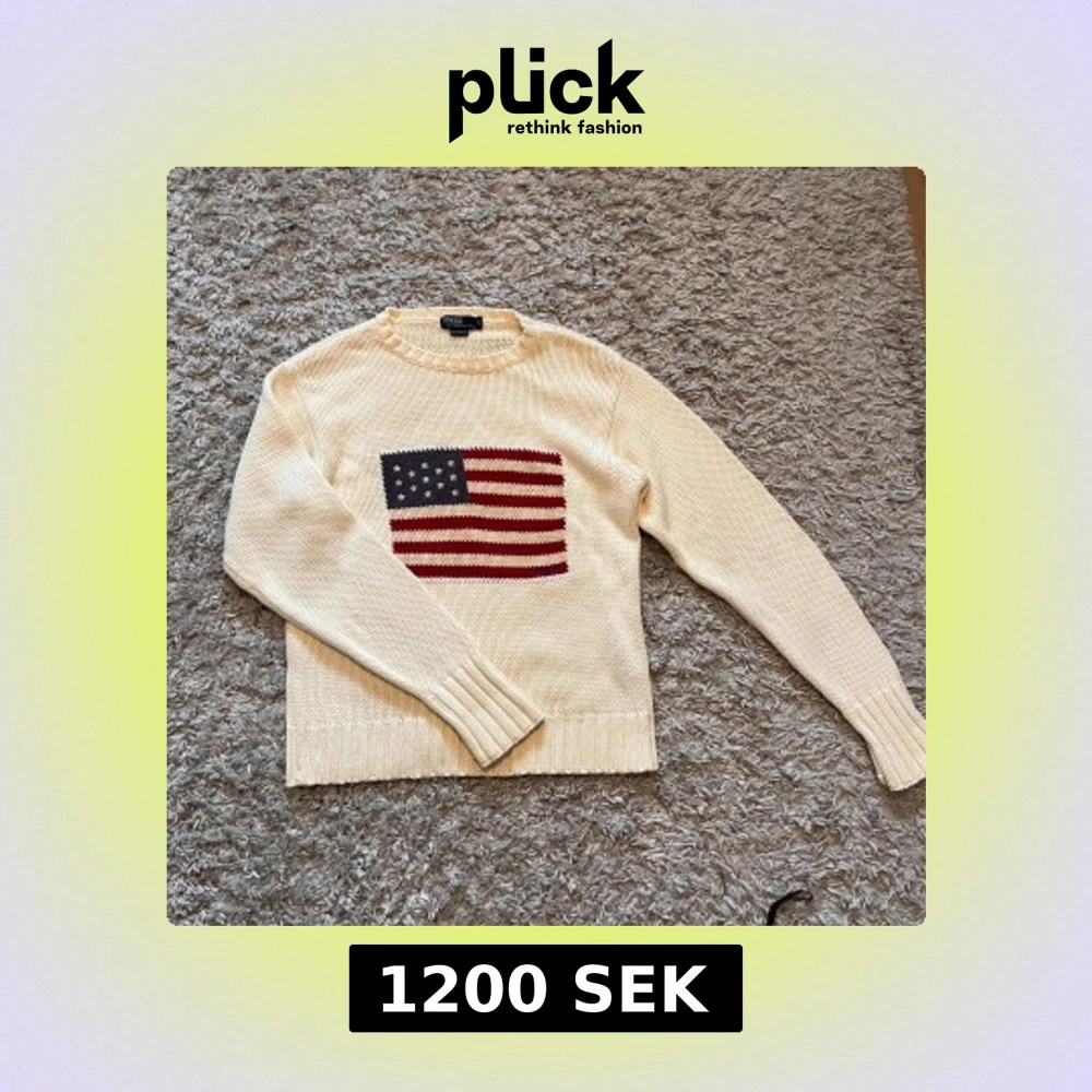 Superfin stickad tröja från Ralph Lauren med broderad USA-flagga på framsidan. Äldre vintage-modell, tillverkad i Hongkong – troligen från 90-talet. Tjock, mjuk bomull i off-white med mörkblått och vinrött motiv. Skick: Mycket bra! En liten fläck på ryggen som knappt syns (bild finns). Perfekt för dig som gillar vintage eller preppy stil!