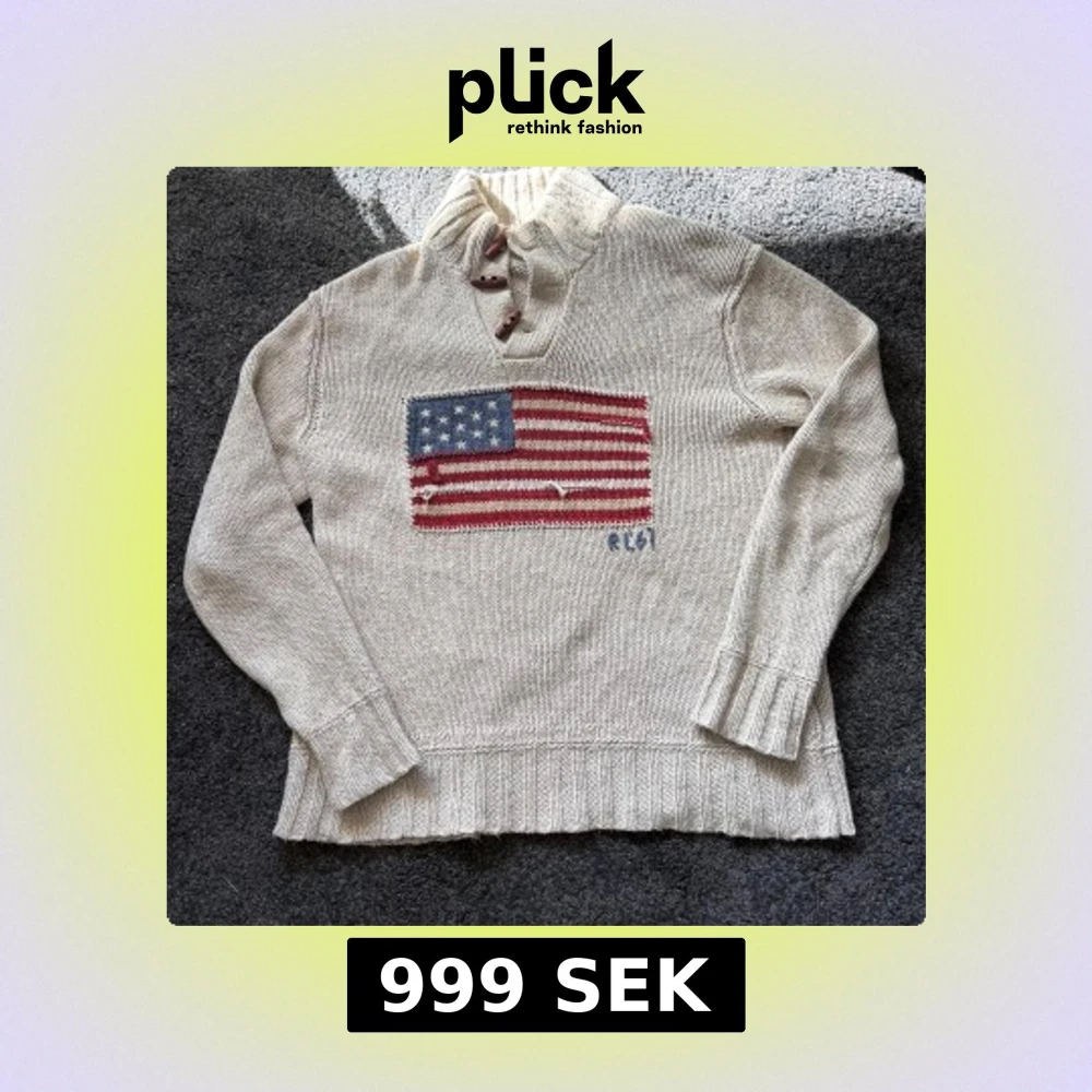 Beige stickad tröja från Polo Ralph Lauren med amerikansk flagga framtill och RL67-broderi. Tröjan har hög krage med tre träknappar och ribbade muddar. Perfekt för dig som gillar klassisk och preppy stil. Väldigt eftertraktad