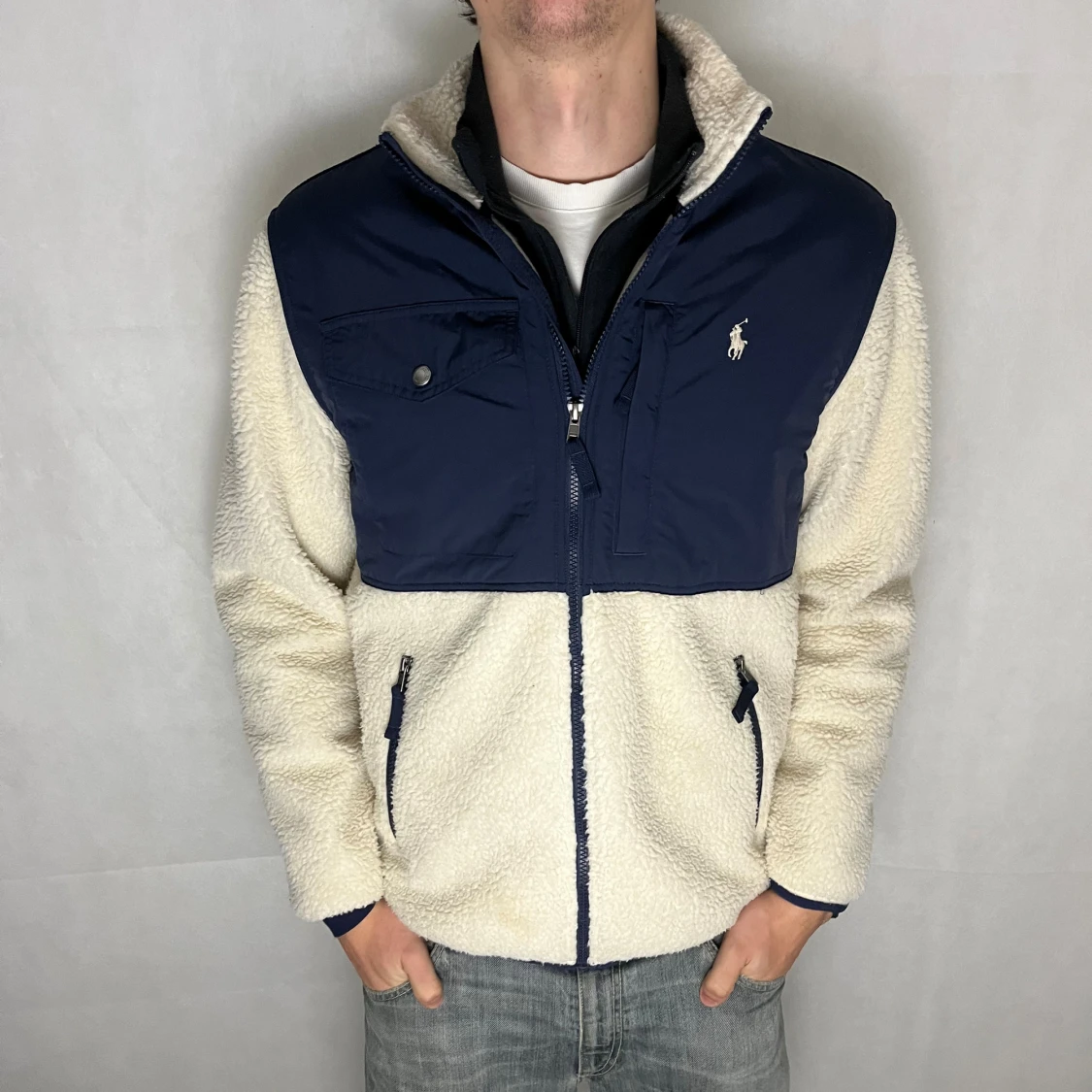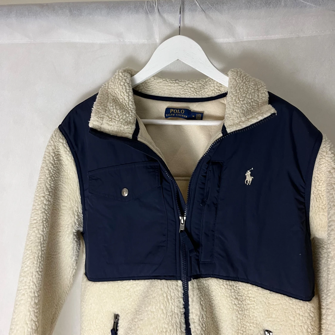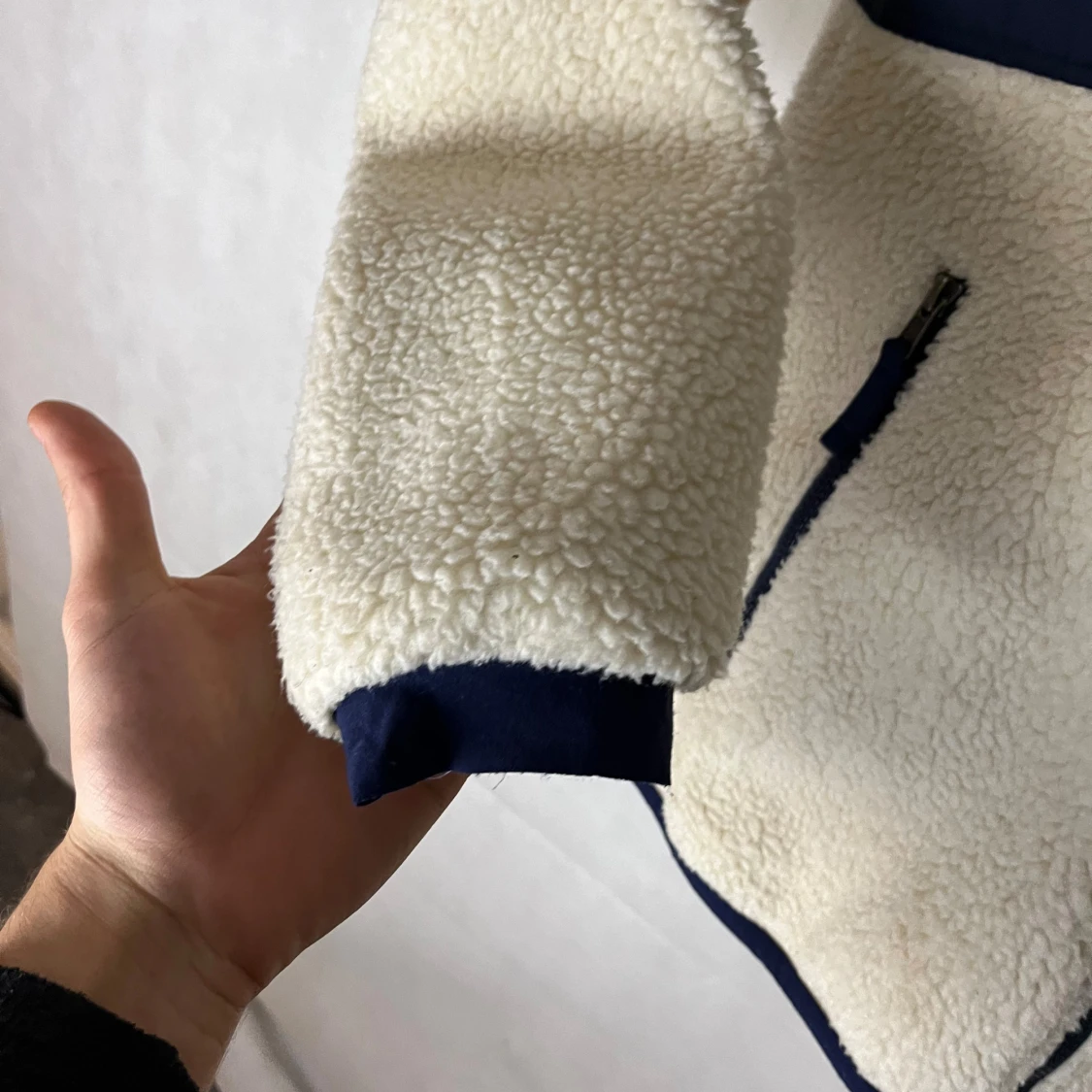 Riktigt soft raffe flis. Storlek M. Modellen är 185. Riktigt fint skick utöver att en sömn har lostnat vid ärmalutet. Inget som riktigt märks.