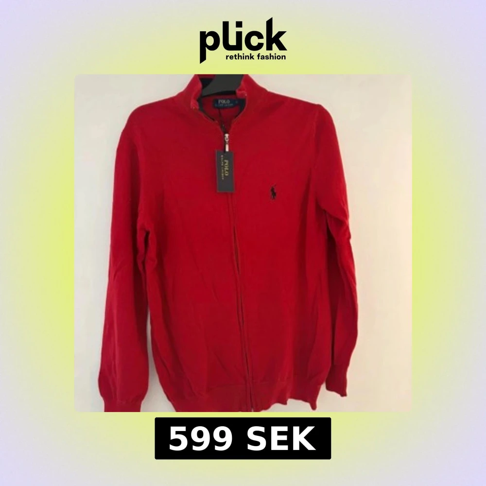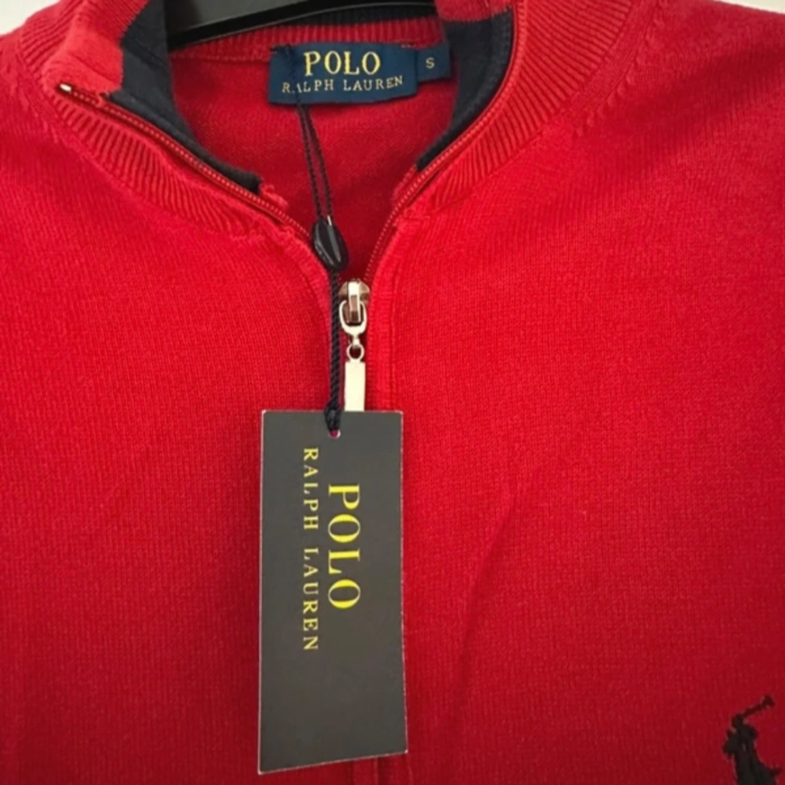 Snygg röd tröja från Polo Ralph Lauren med dragkedja och klassisk krage. Tröjan har långa ärmar och en liten broderad logga på bröstet. Helt ny med prislapp på och köpt för 1999kr:)