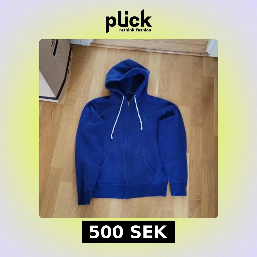 Säljer en klassisk blå hoodie från Polo Ralph Lauren med dragkedja och vit snörning i huvan. Tröjan har två fickor framtill och är tillverkad i mjukt material. Perfekt för en avslappnad stil.