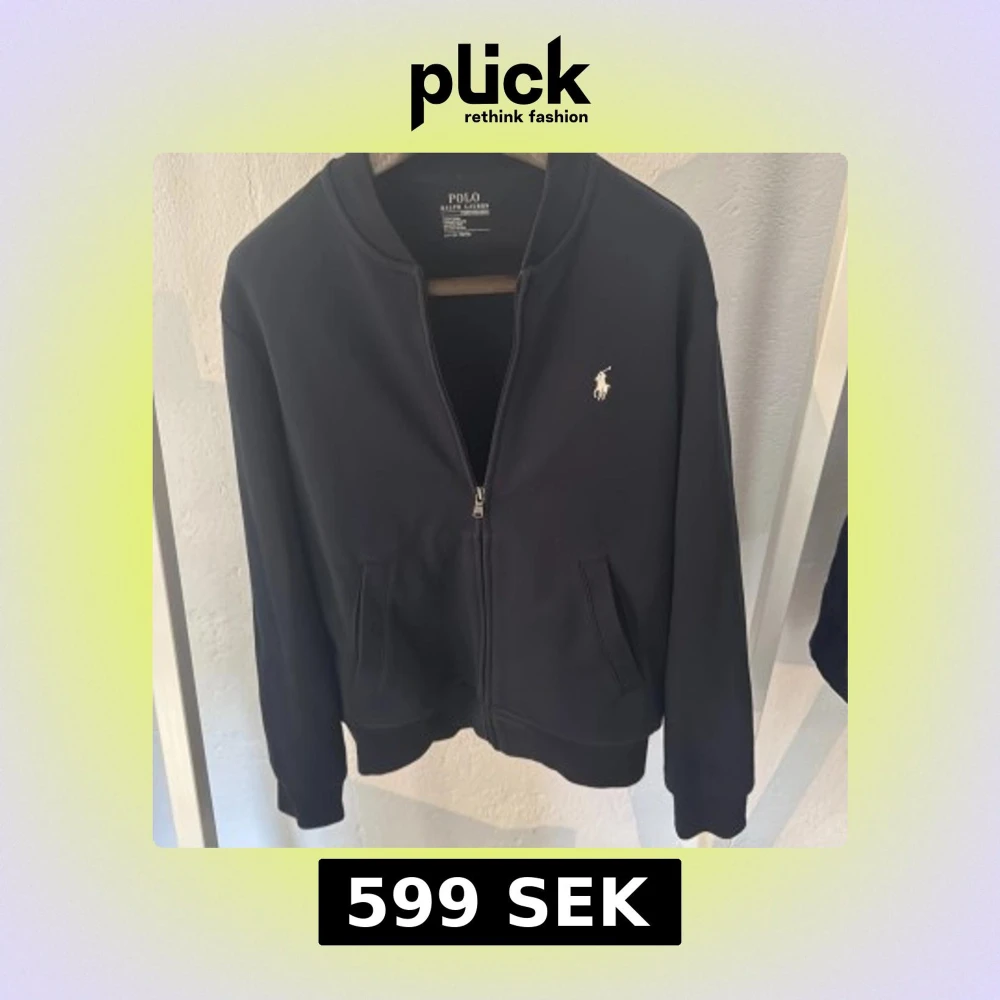 Säljer en marinblå zip-jacka från Polo Ralph Lauren med klassisk broderad logga på bröstet. Jackan har två fickor framtill, ribbade muddar och krage. Perfekt för en stilren och enkel look.