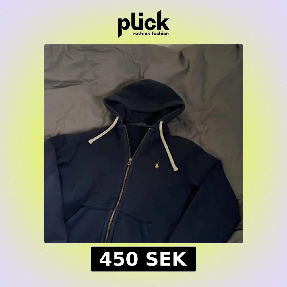 Säljer en mörkblå hoodie från Polo Ralph Lauren med dragkedja och vit snörning i huvan. Klassisk gul logga broderad på bröstet. Perfekt för en avslappnad och stilren look. I st XS