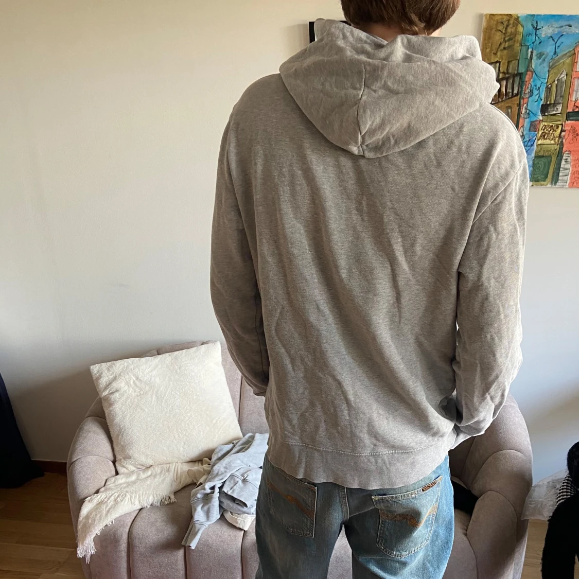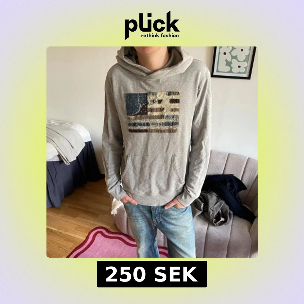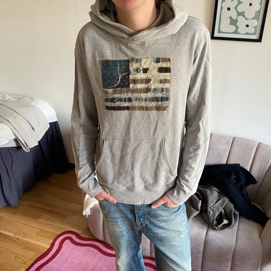 Säljer en grå hoodie med ett unikt denim på framsidan. Tröjan har en bekväm passform med långa ärmar och en praktisk magficka. Perfekt för en avslappnad stil. Riktigt schysst och laidback. Ralph lauren denim supply riktigt grisch. Jag är 183cm lång.