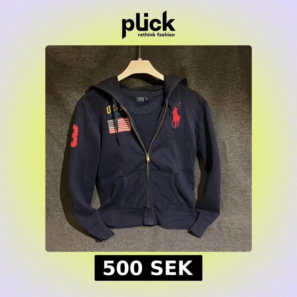 Säljer en snygg mörkblå hoodie från Polo Ralph Lauren med dragkedja och luva . Den har en stor röd häst på bröstet, USA-flagga och 3 på ärmen. Skick 7/10, Stl Xs men sitter lite mindre